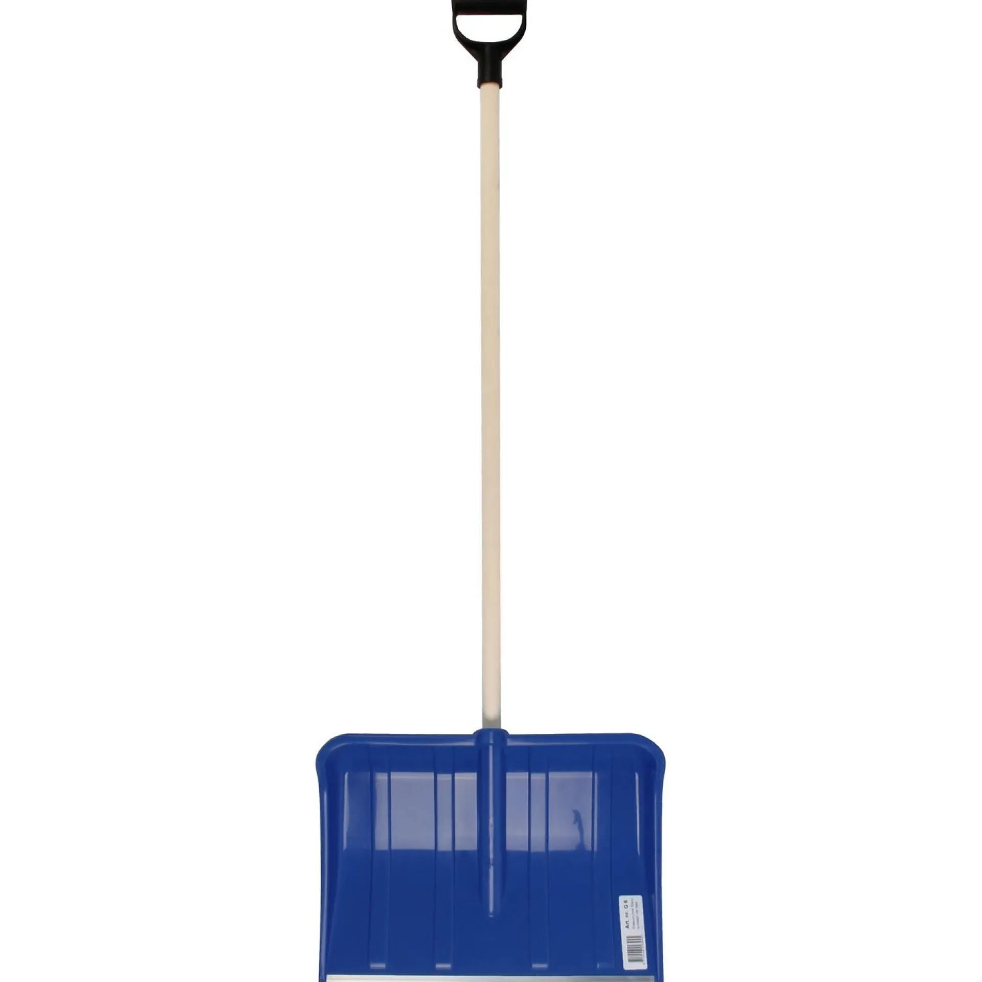 Sneeuwschop van Talen Tools met een blauw kunststof blad van 48 cm breed, houten steel van 110 cm en metalen strip aan de onderzijde voor het eenvoudig wegschuiven van sneeuw.