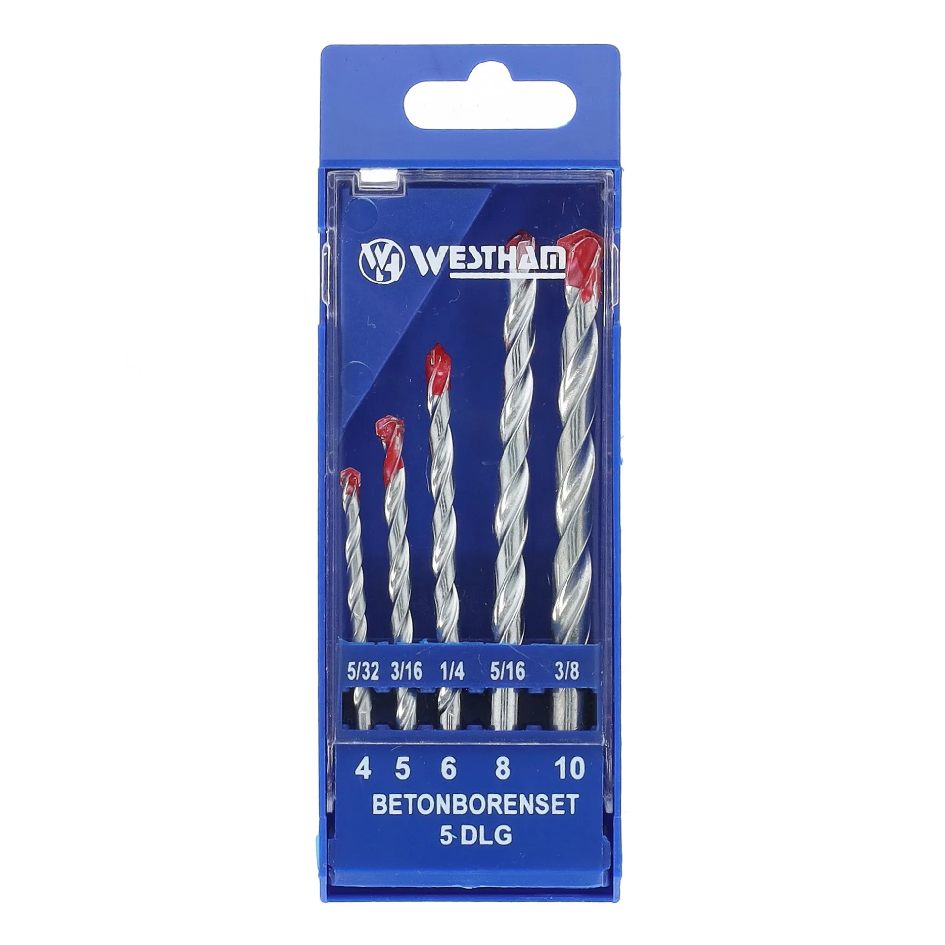 Deze Westham betonborenset 5 dlg is geschikt voor het boren in beton en bestaat uit vijf betonboren in de maten 4, 5, 6, 8 en 10 mm. De boren zijn overzichtelijk verpakt in een compacte kunststof cassette, waardoor ze netjes bij elkaar blijven en gemakkelijk mee te nemen zijn. Dankzij de duidelijke maatvermelding op de houder pak je snel de juiste boor voor je klus. Deze set is handig voor uiteenlopende boorwerkzaamheden waarbij verschillende diameters nodig zijn.