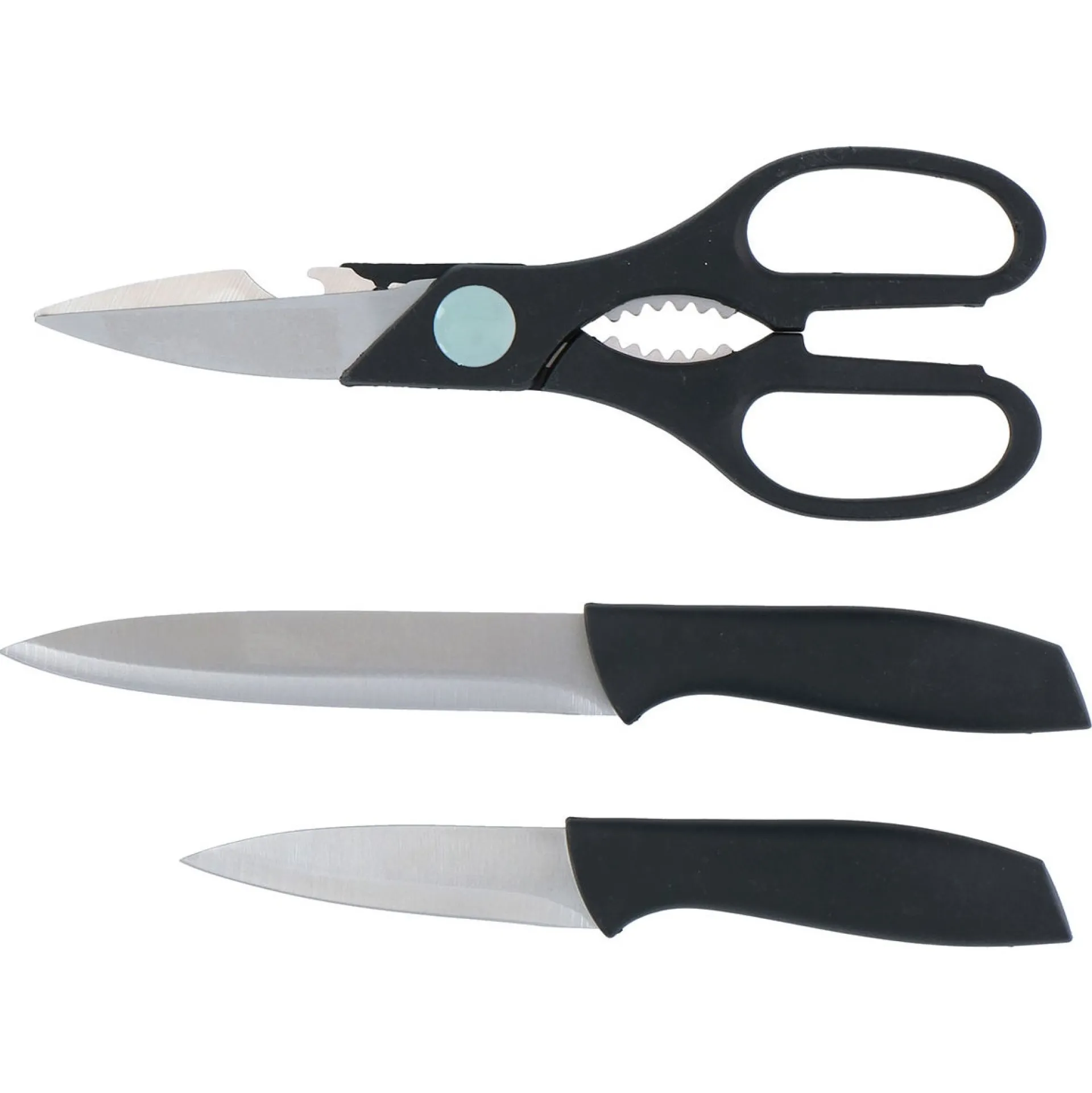 3-delige keuken messen set plus nog een schaar, onmisbaar in elke keuken. Het betreft een huishoudschaar, een groot snijmes en een aardappelschilmesje. De mesjes kunnen in de vaatwassen, de schaar kunt u voor behoud van het product beter even afspoelen.