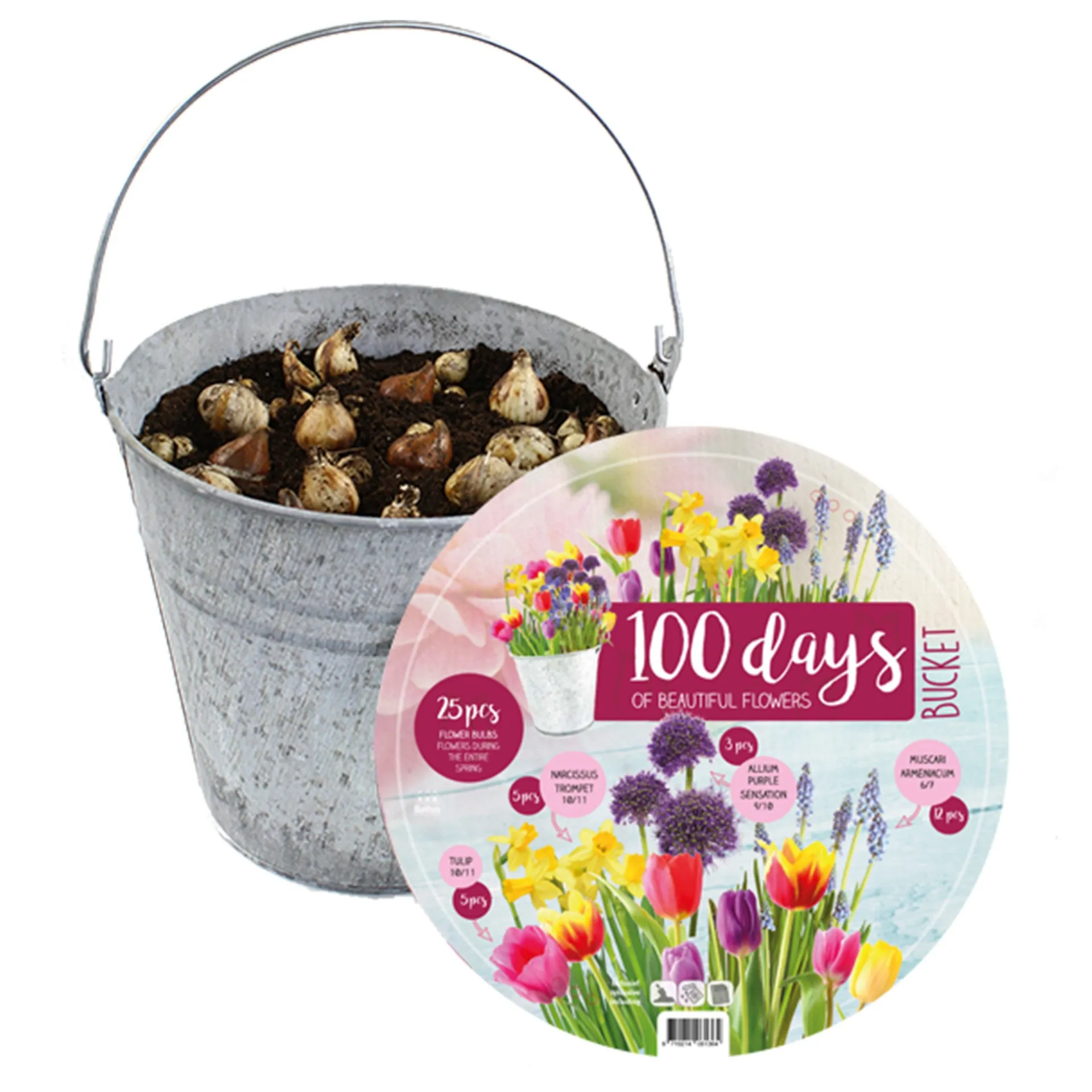 Emmer gevuld met 25 bloembollen in een mix van verschillende soorten. Het pakket bevat tulpen, narcissen, allium en muscari, die elkaar opvolgen in bloei. Hiermee ontstaat een kleurrijke bloemenweergave gedurende ongeveer 100 dagen in het voorjaar.