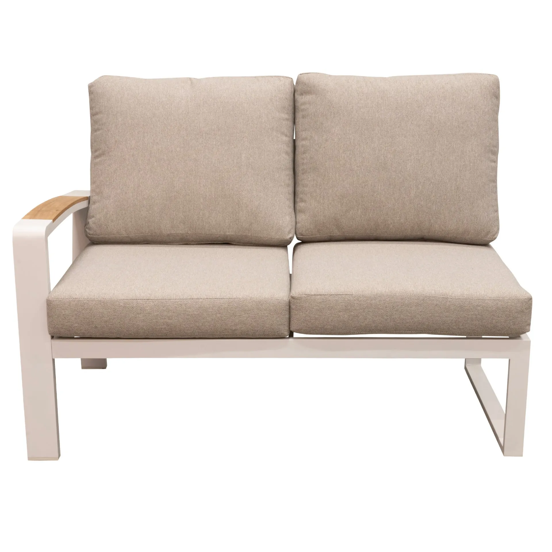 De Foxton bank links met 2-zit is een moderne en elegante bank die een lichte en luchtige uitstraling biedt. De witte kleur zorgt voor een elegante en tijdloze sfeer die goed te combineren is met diverse stijlen. De bank is van aluminium en is daardoor weersbestendig. De zachte kussens zorgen voor extra zitcomfort.