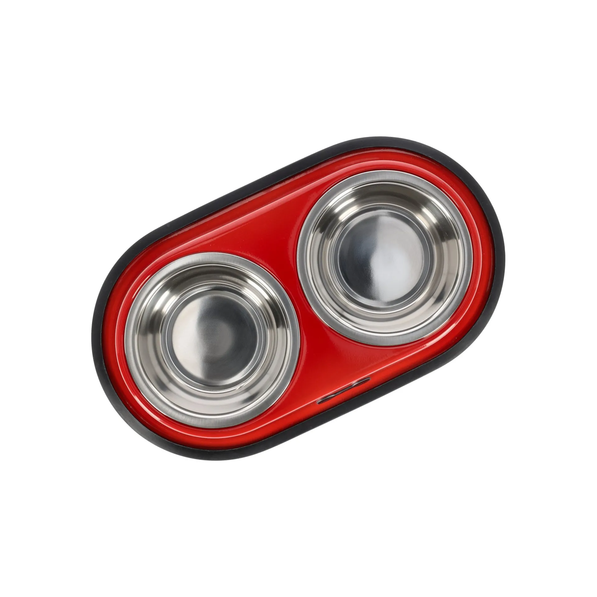 Dubbele voederbak met uitneembare roestvast staal bakjes in een houder met antisliprand.
