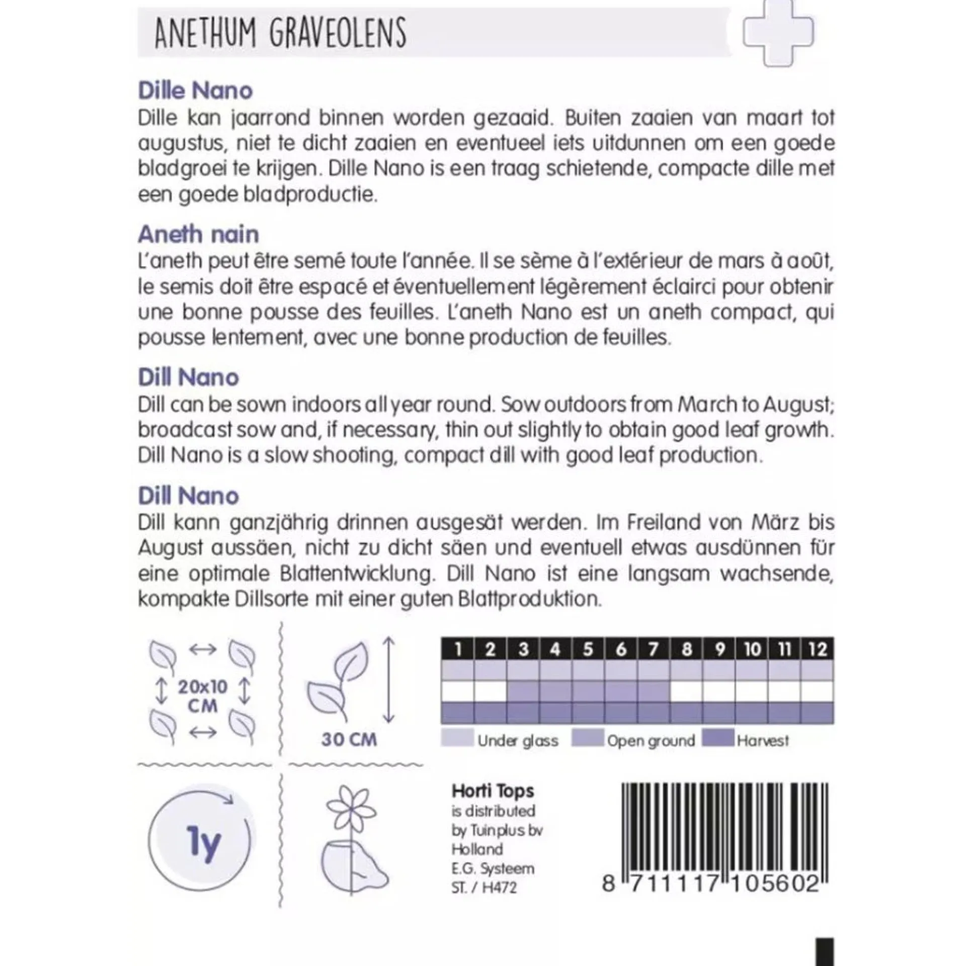 Dille kan jaarrond binnen worden gezaaid. Buiten zaaien van maart tot augustus, niet te dicht zaaien en eventueel iets uitdunnen om een goede bladgroei te krijgen. Dille Nano is een traag schietende, compacte dille met een goede bladproductie.