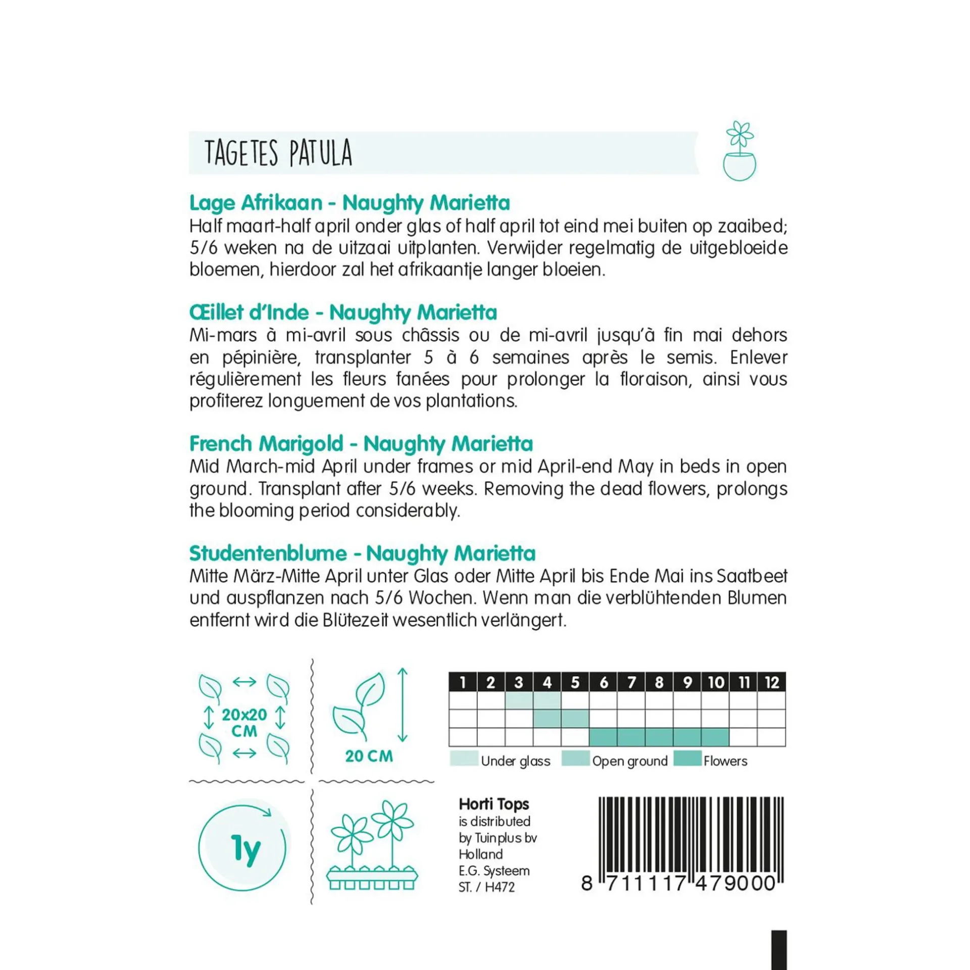 Een opvallende eenjarige plant met heldergele bloemen en een bordeauxrode kern. Gemakkelijk te verzorgen en met een lange bloeiperiode. Ideaal voor bloembedden, borders en potten. Tagetes-planten (Afrikaantjes) staan erom bekend dat zij schadelijke insecten op afstand houden, terwijl ze nuttige bijen en vlinders aantrekken. Een uitstekende keuze voor een kleurrijke tuin.
