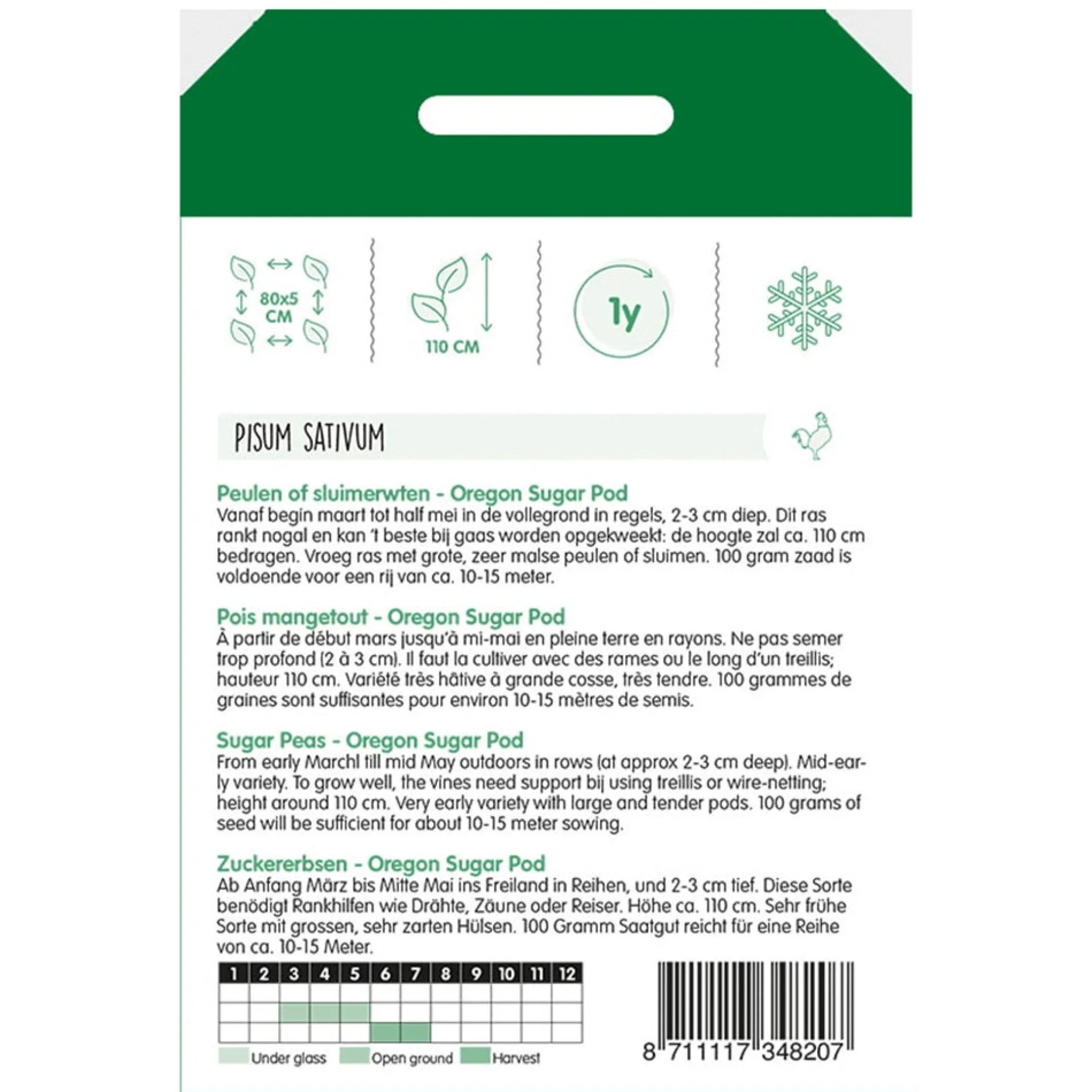 Oregon Sugar produceert vroeg in het seizoen zoete, malse peulen die in hun geheel eetbaar zijn. De planten bereiken ±90 cm en zaaien kan vanaf april. Ideaal voor in de moestuin bij een gaassteun.