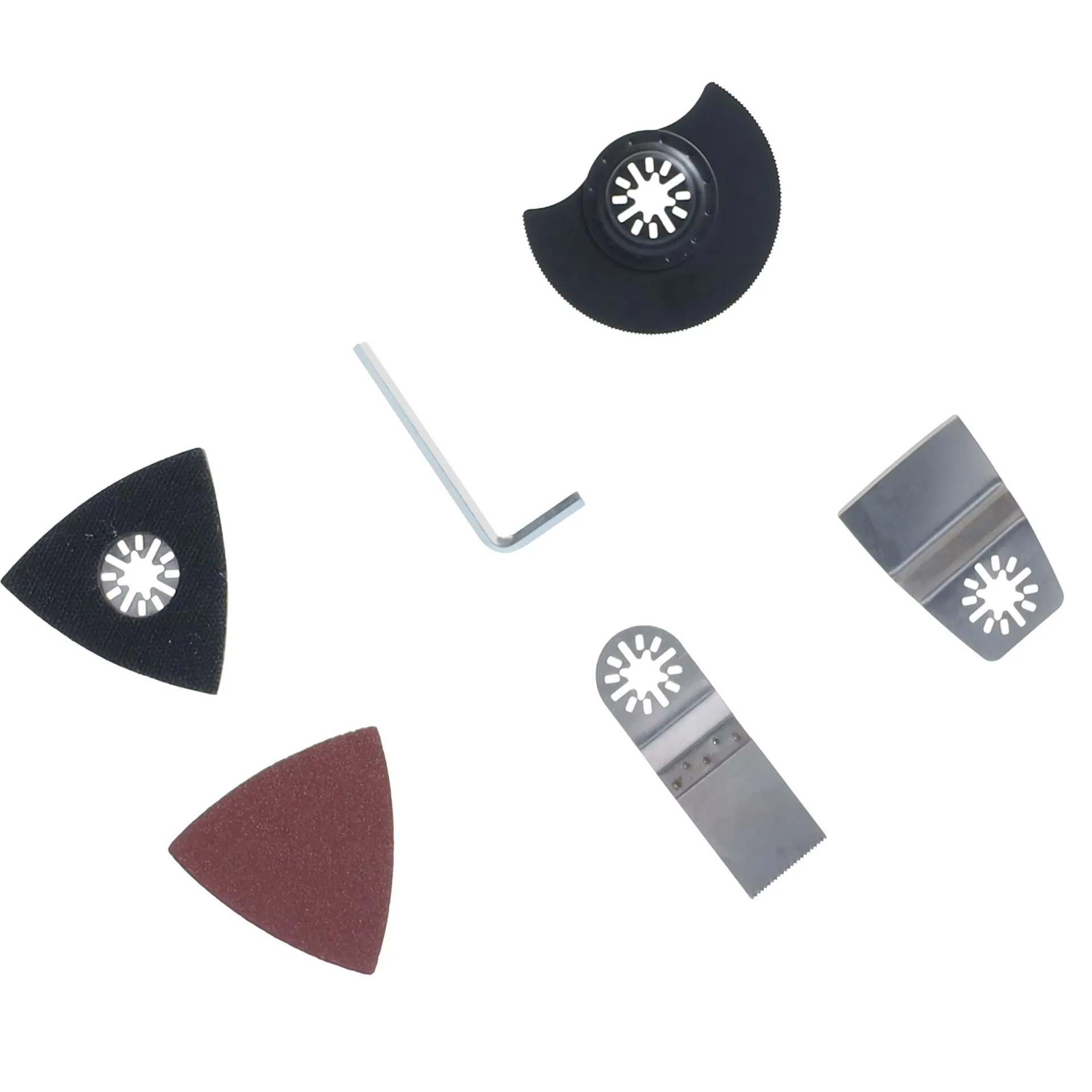 Een compacte multitool (200 watt, 220–240 V) die kan schuren met een deltavormige schuurzool, tegels los kan maken met schraapmessen en invalzaagsneden kan maken in laminaat en hout. Geschikt voor gebruik met extra accessoire-sets voor multitools.