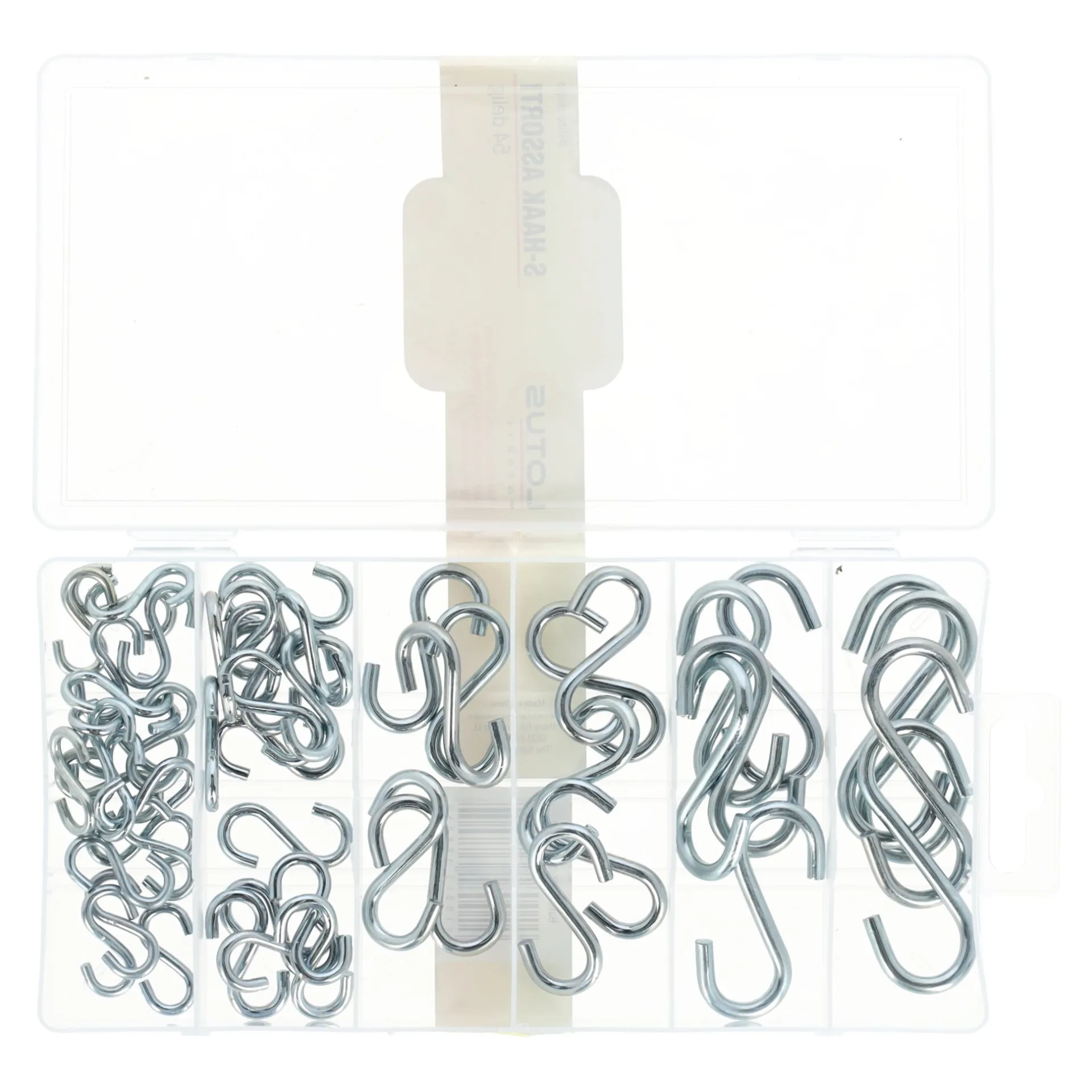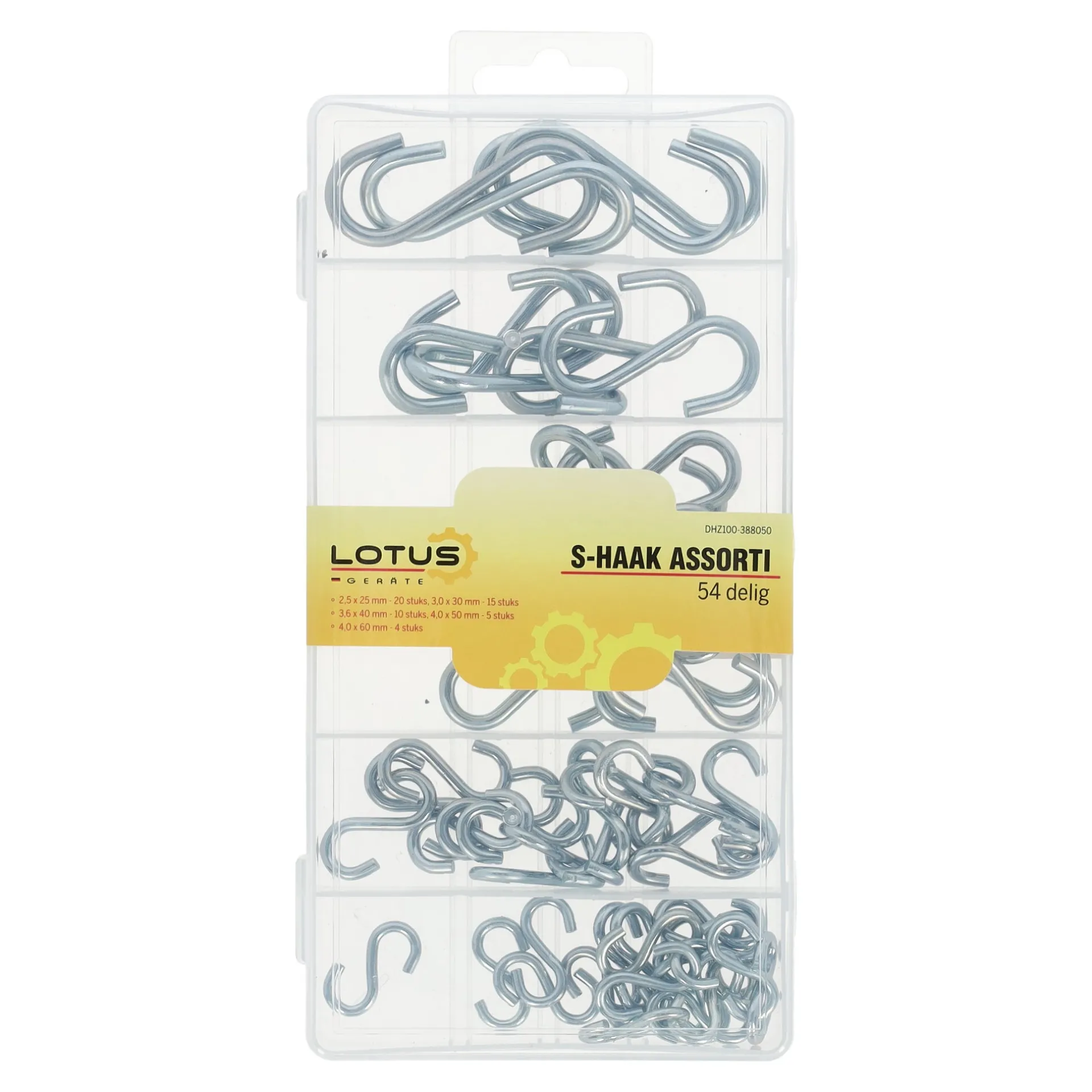 Deze set van Lotus bevat 54 S-haken in verschillende maten, netjes geordend in een transparante opbergdoos met vakverdeling.