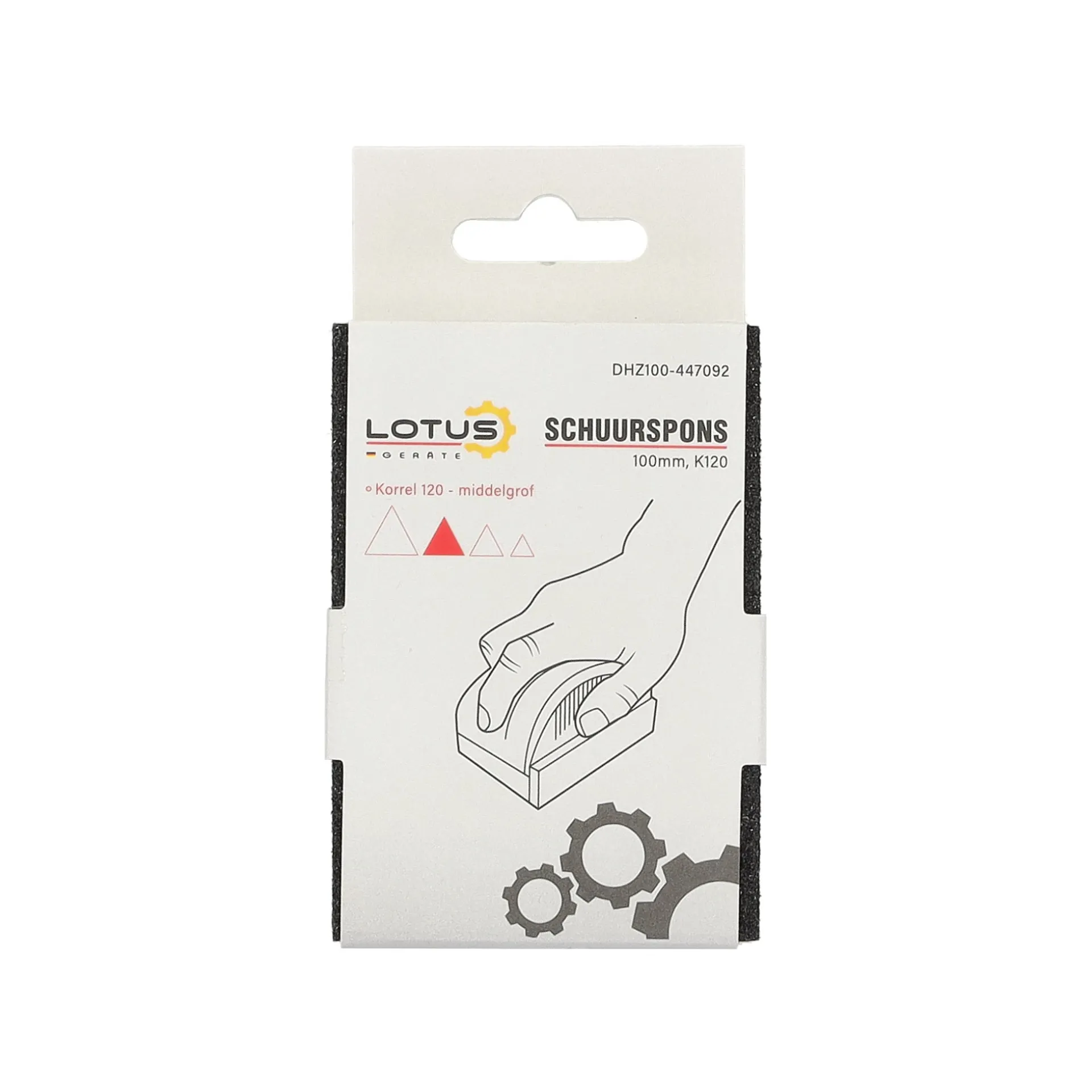 Schuurspons van Lotus met lengte 100 mm. De middelgrote schuurkorrel (K120) is geschikt voor het egaliseren van oppervlakken na grof schuren en het verminderen van zichtbare krassen.