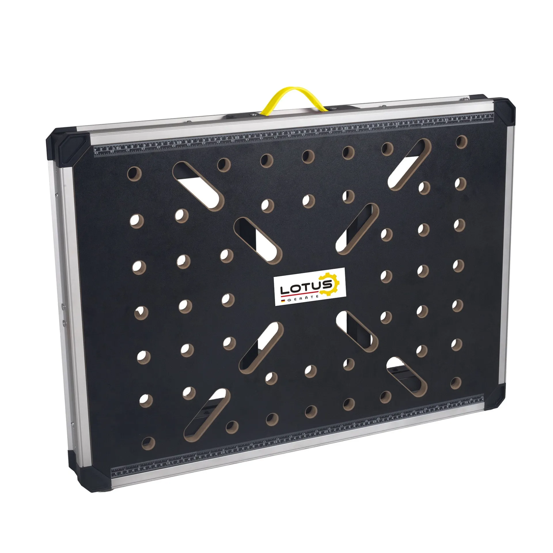 Opvouwbare werktafel met een robuust werkblad voorzien van een raster van ronde en sleufvormige openingen. Het blad is geïntegreerd in een aluminium frame met schaalverdeling langs de randen. De inklapbare poten zijn in hoogte verstelbaar en voorzien van verstevigingsbeugels. Accessoires zoals klemmen en houders kunnen rondom het blad worden bevestigd. De tafel is draagbaar dankzij een handgreep en compact op te bergen door het vlak inklapbare ontwerp.