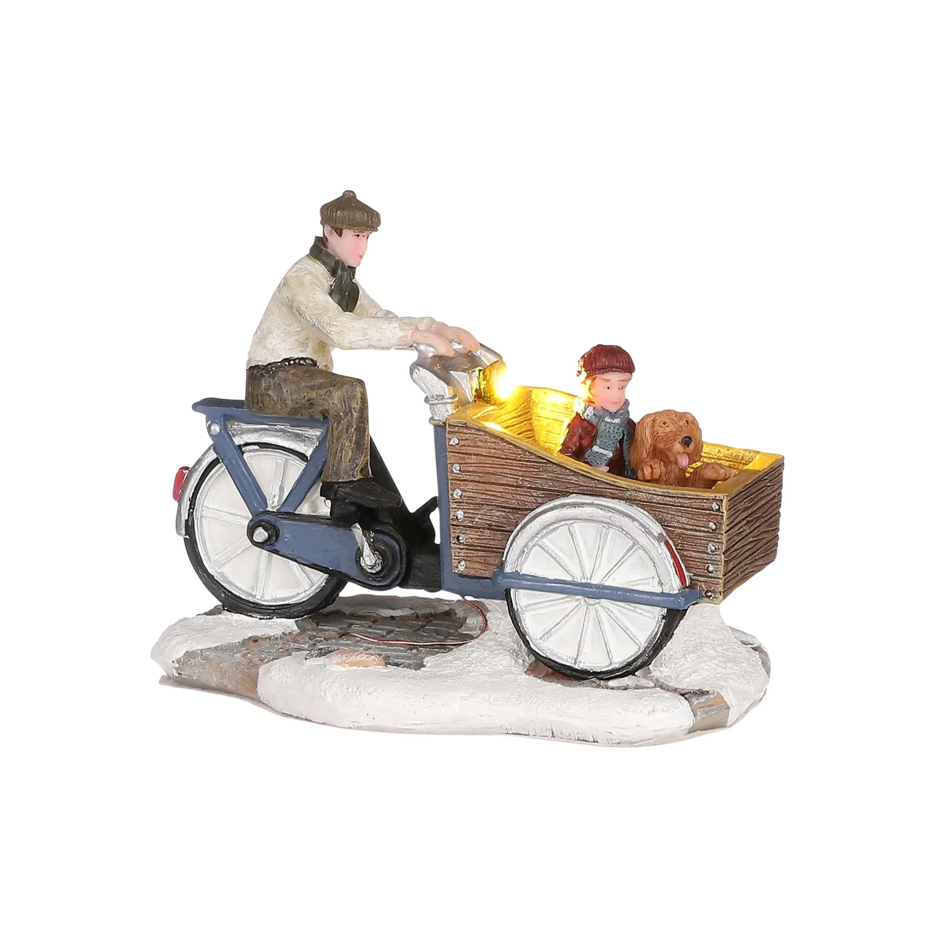 Winterse familiescène met een bakfiets, passend binnen elk miniatuur kerstdorp.