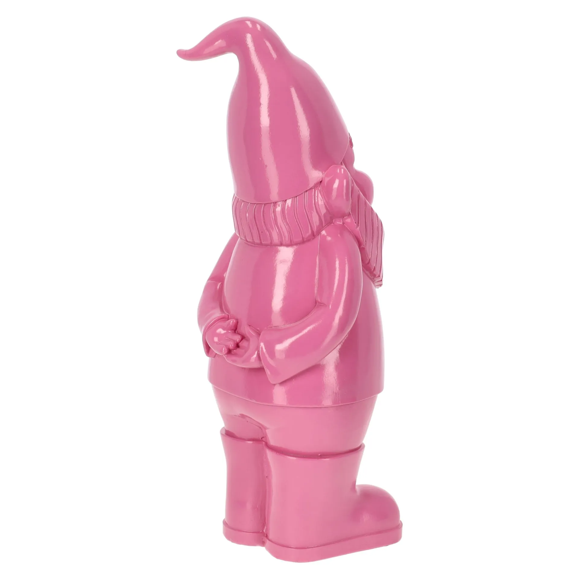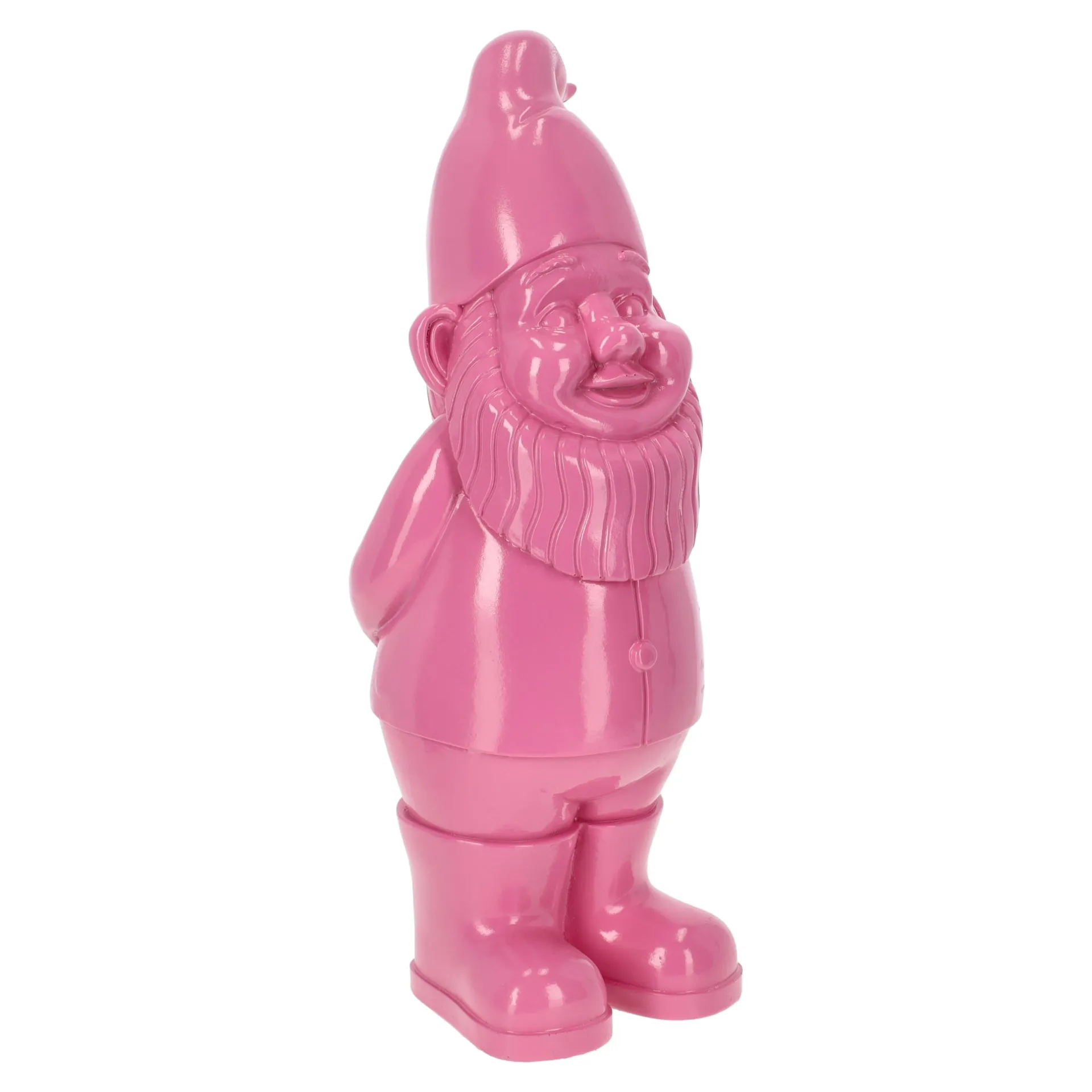 Vrolijke kabouter in een opvallende fuchsiakleur. Gemaakt van stevig kunststof met een glanzende afwerking. Een speelse blikvanger voor binnen of buiten.