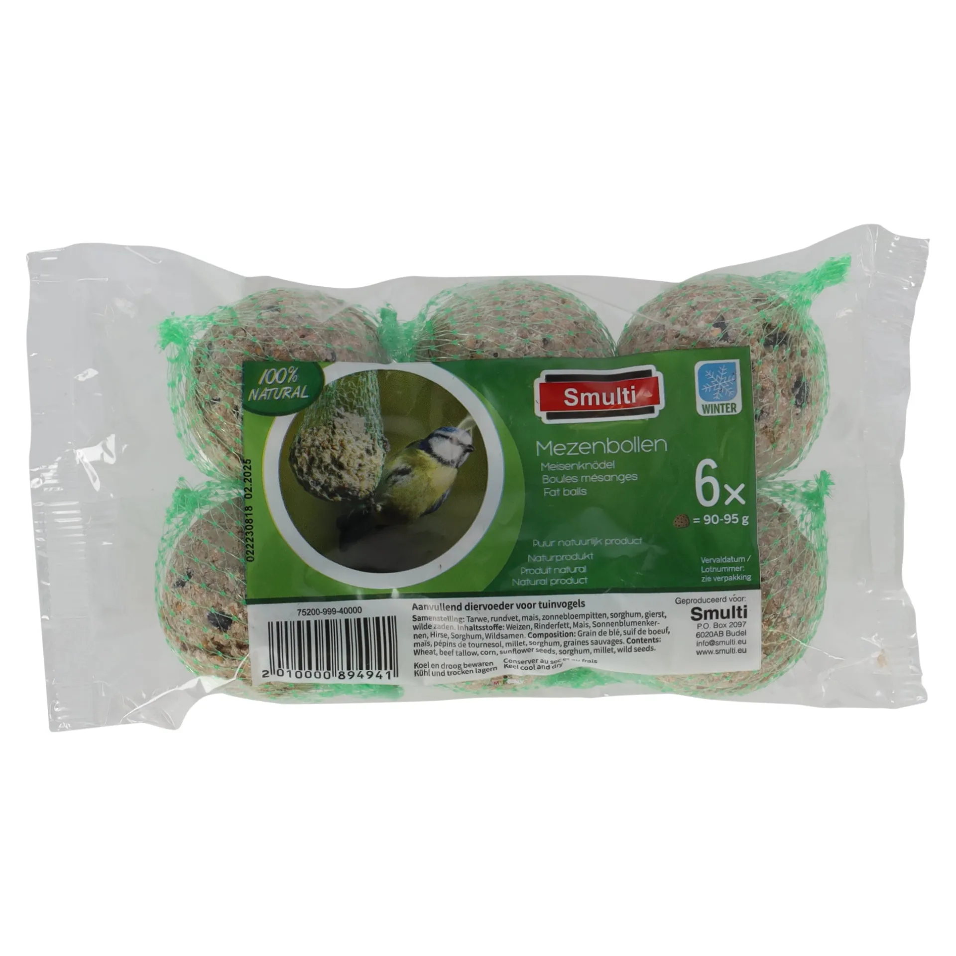 Zes ballen zijn verpakt in een net. De balletjes zijn gemaakt van granen, oliën, vetten, mineralen en zaden.