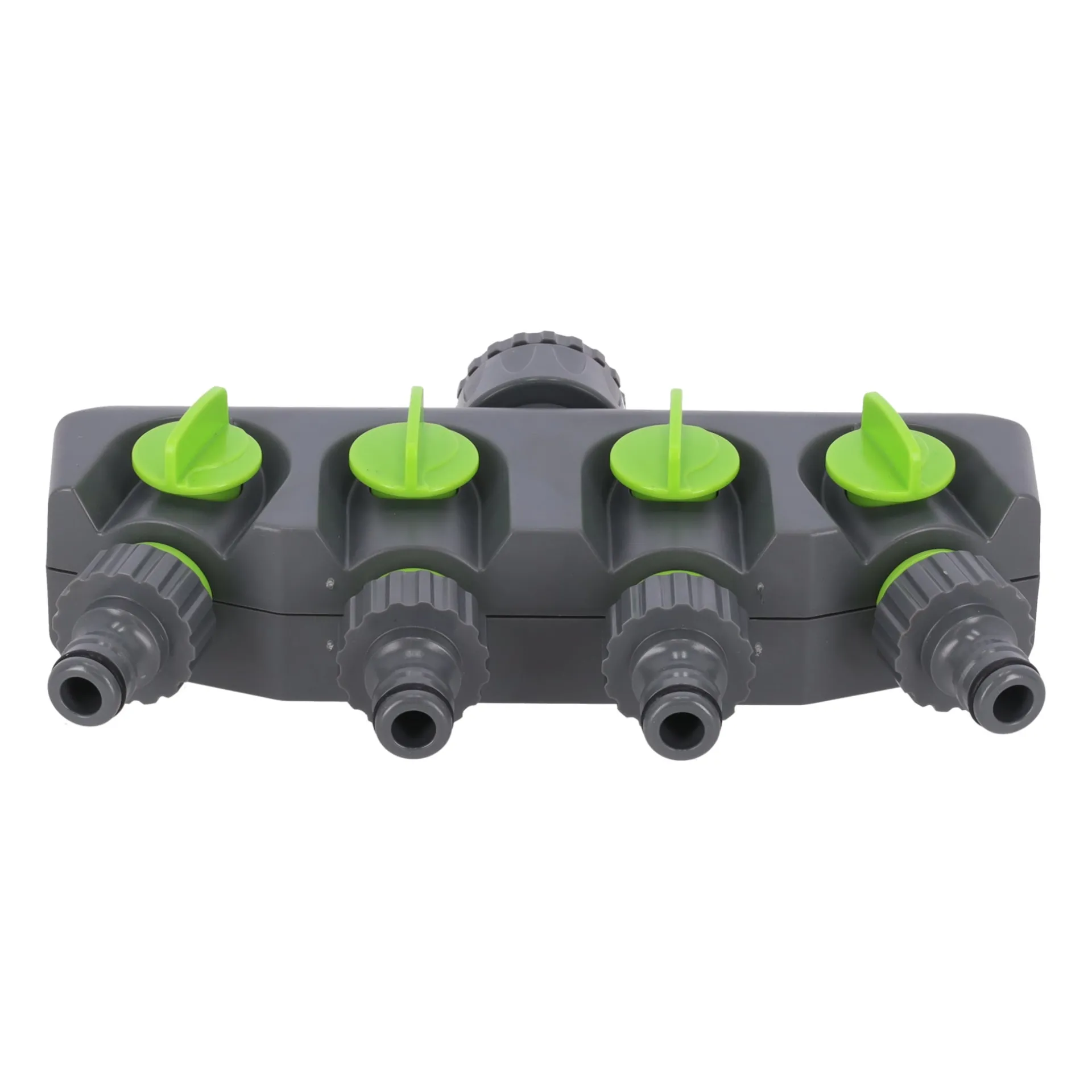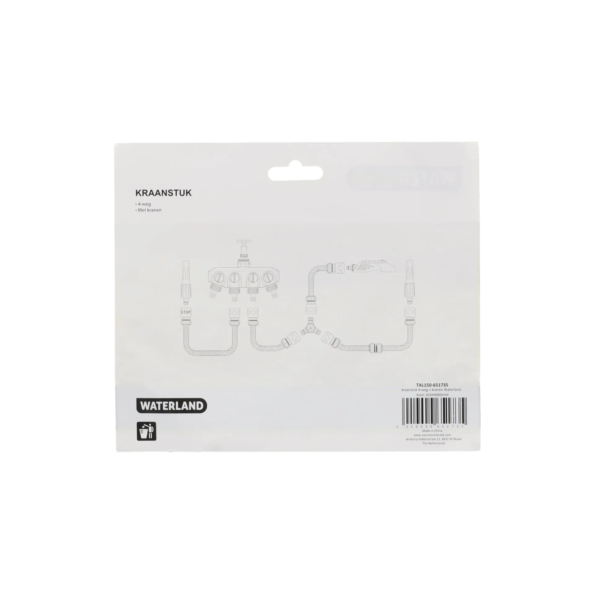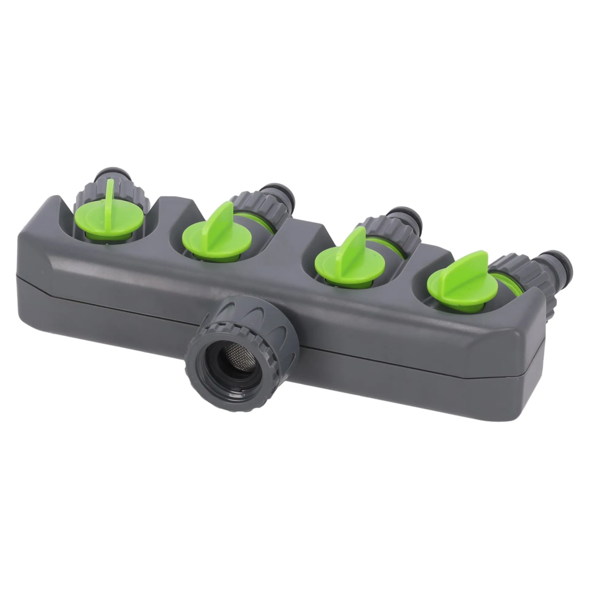 Een 4-weg kraanstuk voor het bedienen van vier bewateringsaccessoires. Iedere doorvoer is apart regelbaar, waardoor slangwisselen niet meer nodig is. Aansluiting 3/4, 1/2 binnendraad.