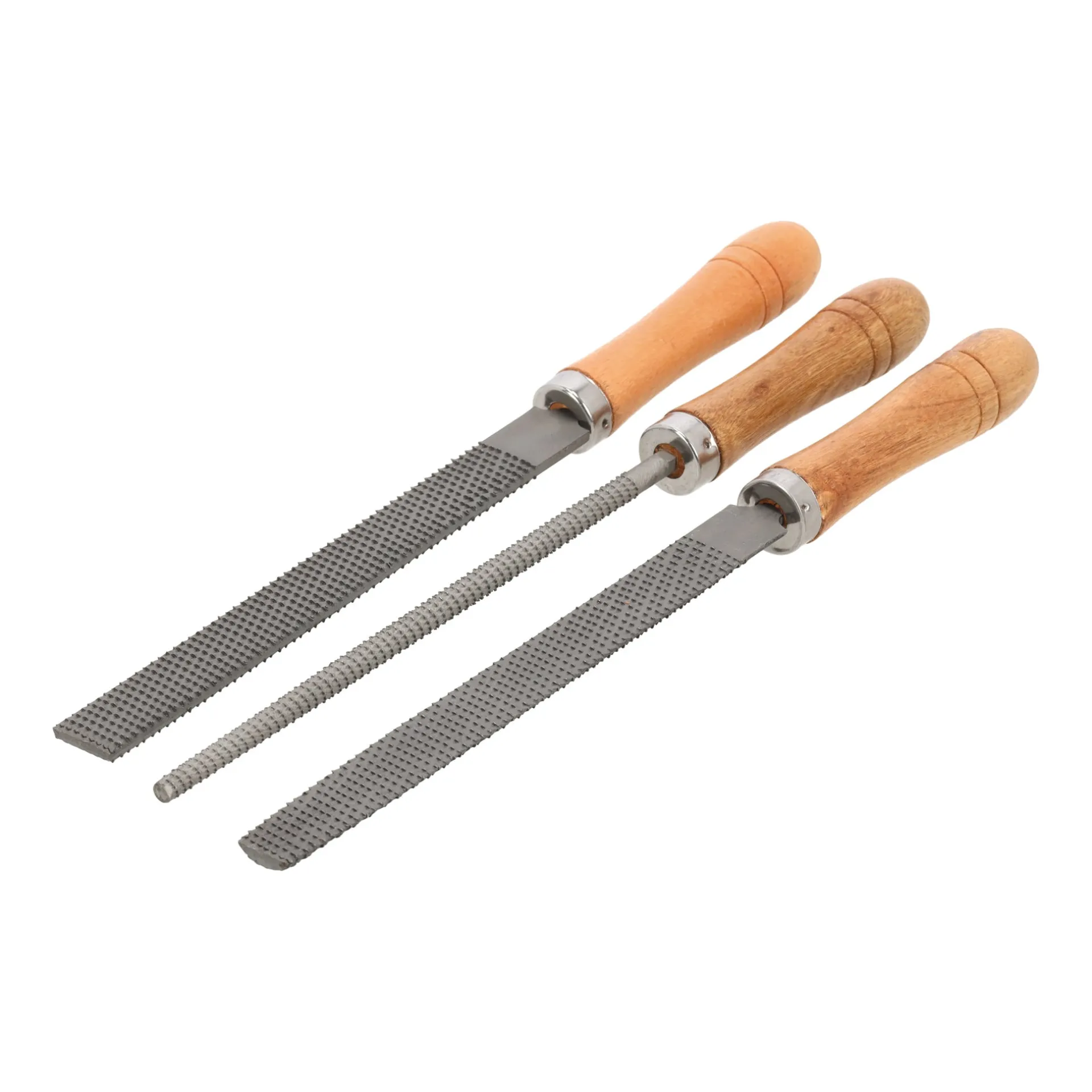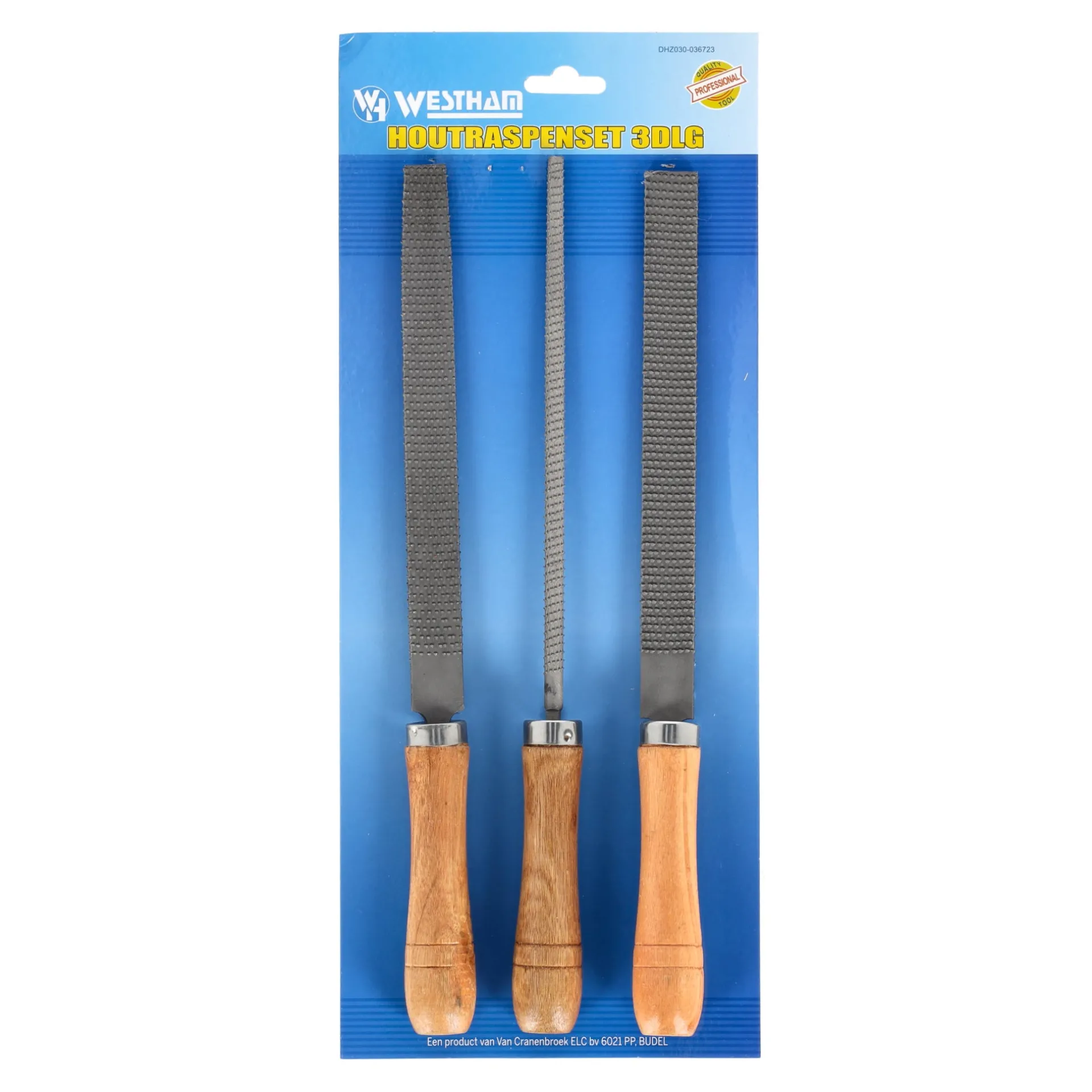 De set bevat drie raspen: plat, rond en halfrond. Ze zijn ideaal voor het bewerken van hout, metaal en andere materialen. Gemaakt van hoogwaardig metaal, wat duurzaamheid en comfort in gebruik garandeert. Deze set is nuttig voor zowel professionele ambachtslieden als amateurs.