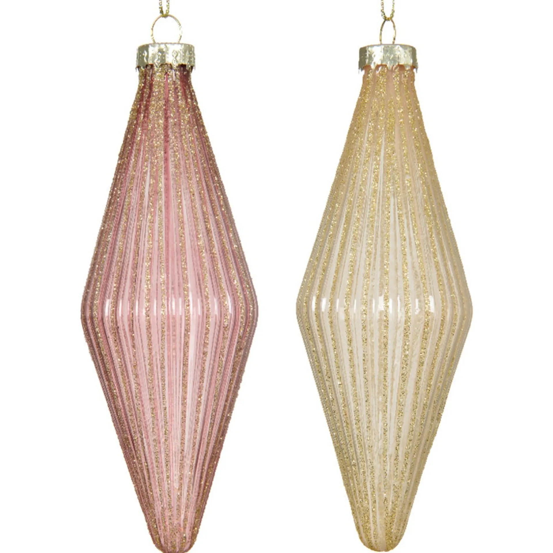 Glazen hanger van 14 cm in roze en crèmekleur met verticale gouden glitterstrepen. De langgerekte vorm geeft een elegante uitstraling, verkrijgbaar in twee stijlvolle varianten.