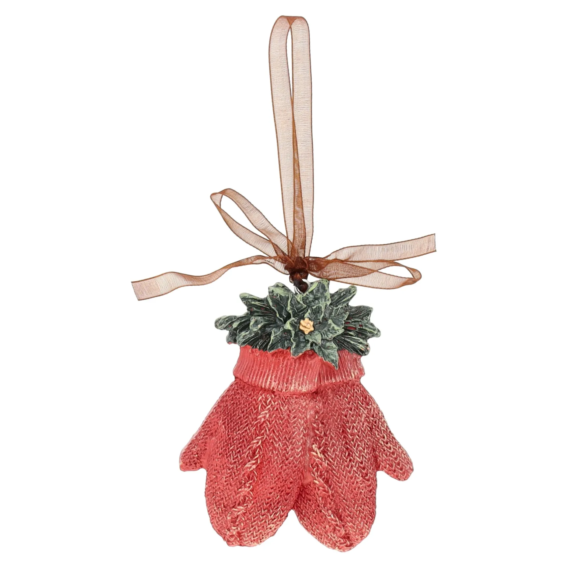 Schattige kersthanger in de vorm van rode wanten met groene blaadjes en een klein bloemetje. Gemaakt van polyresin en voorzien van een bruin lint om op te hangen. Een warme, winterse toevoeging aan je kerstdecoratie.