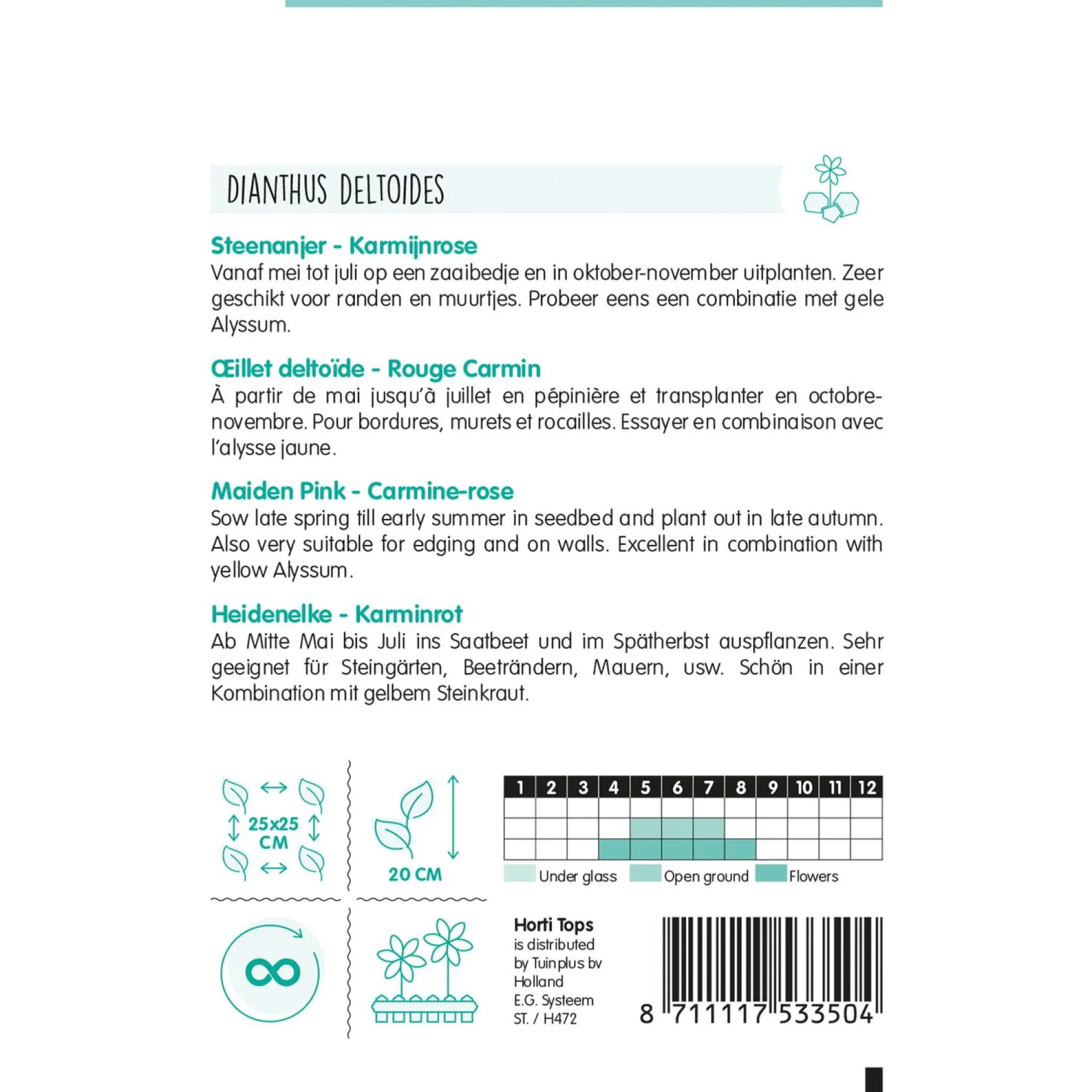 Een opvallende sierplant met felgekleurde bloemen in karmijnroze tinten. Perfect voor het verfraaien van borders, bloembedden en tuinen. Heeft een aangename geur en een lange bloeiperiode. Deze Dianthus-soort is geschikt voor zonnige plekken in de tuin.