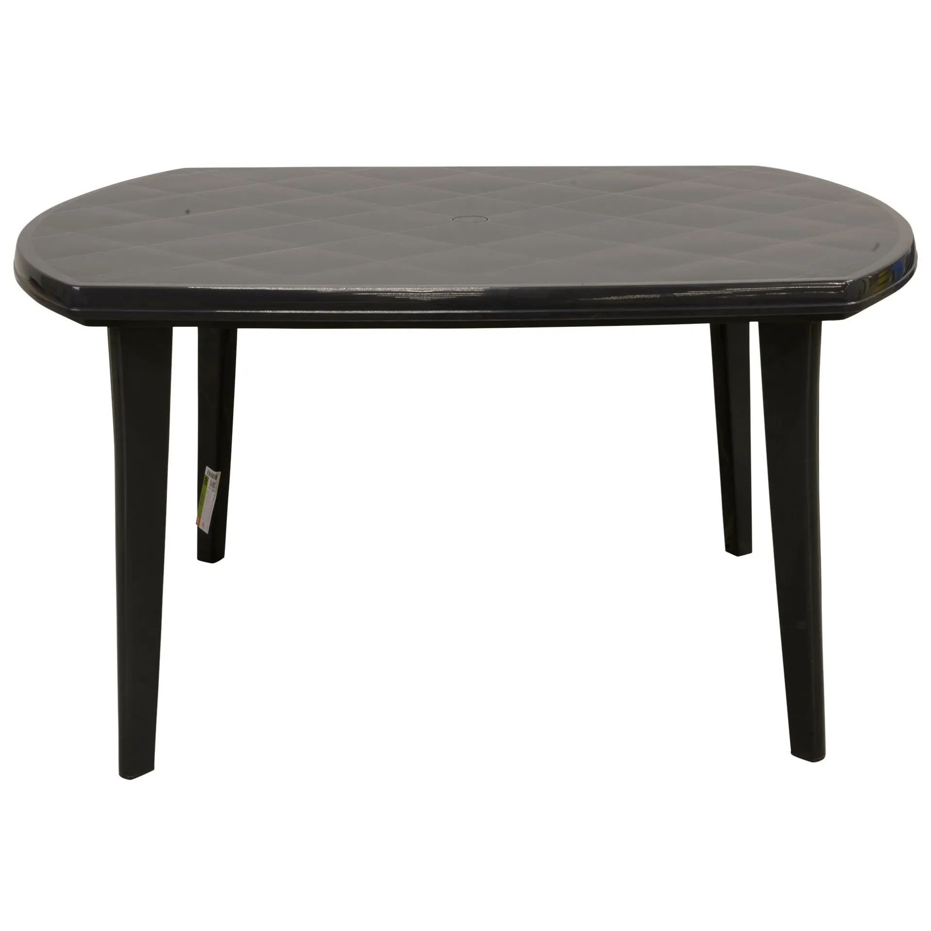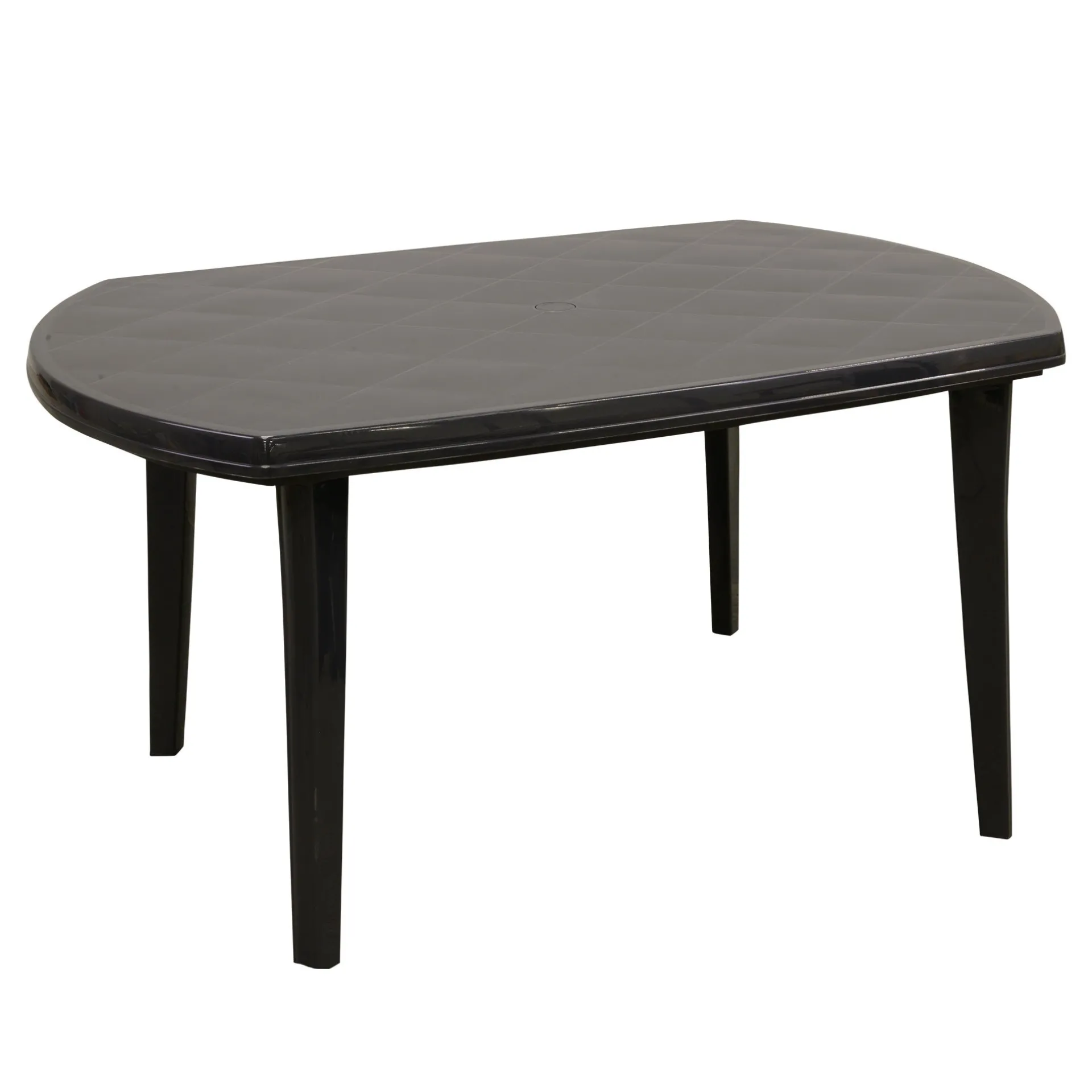 Compacte en praktische kunststof tafel in grafiet kleur, geschikt voor gebruik binnen en buiten. Handig voor eten, werken of ontspannen in kleine ruimtes.