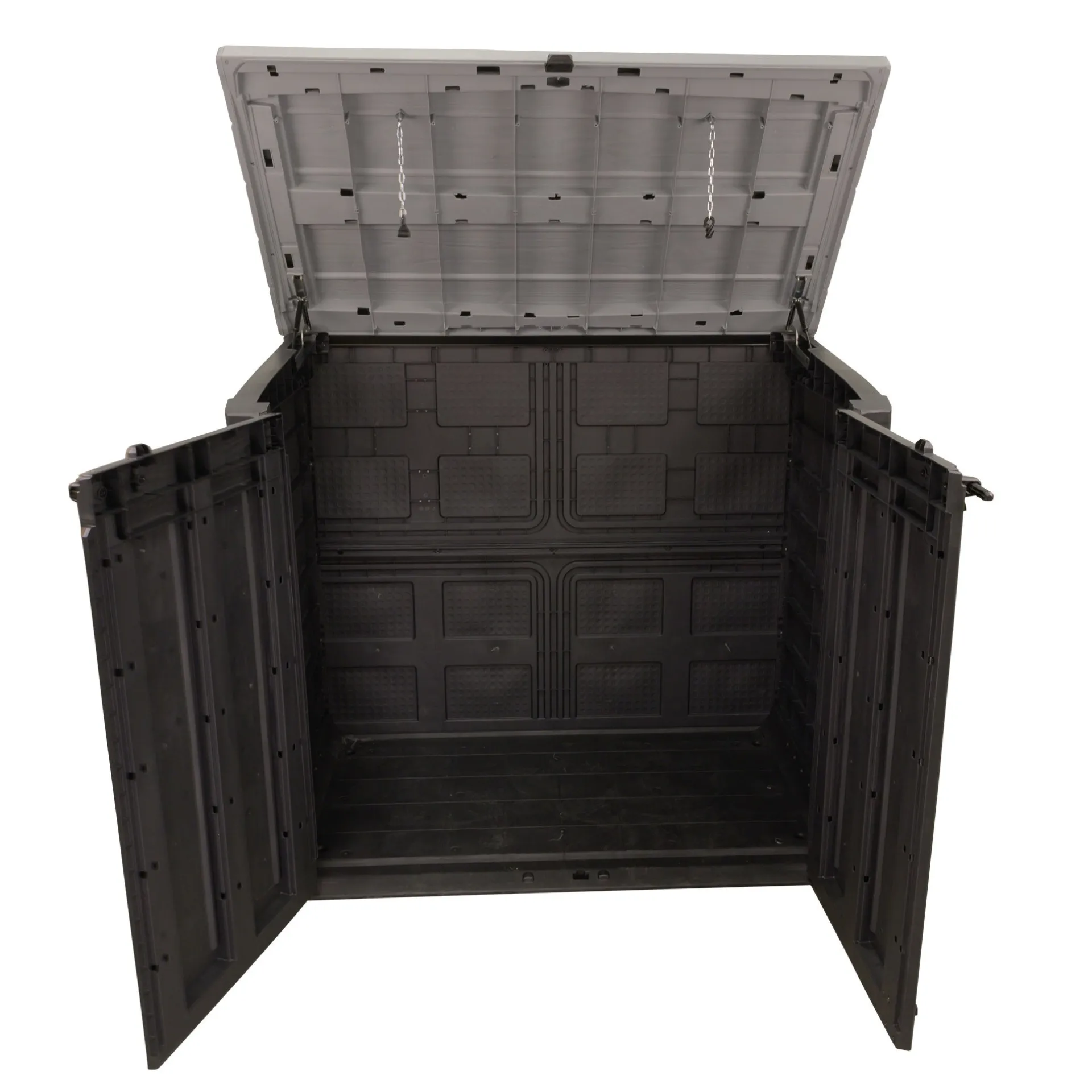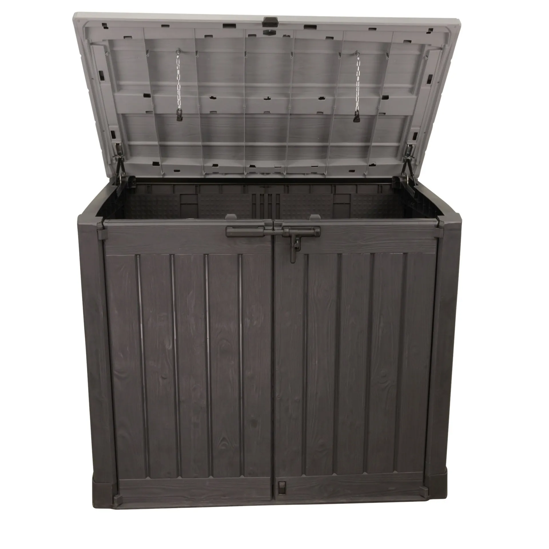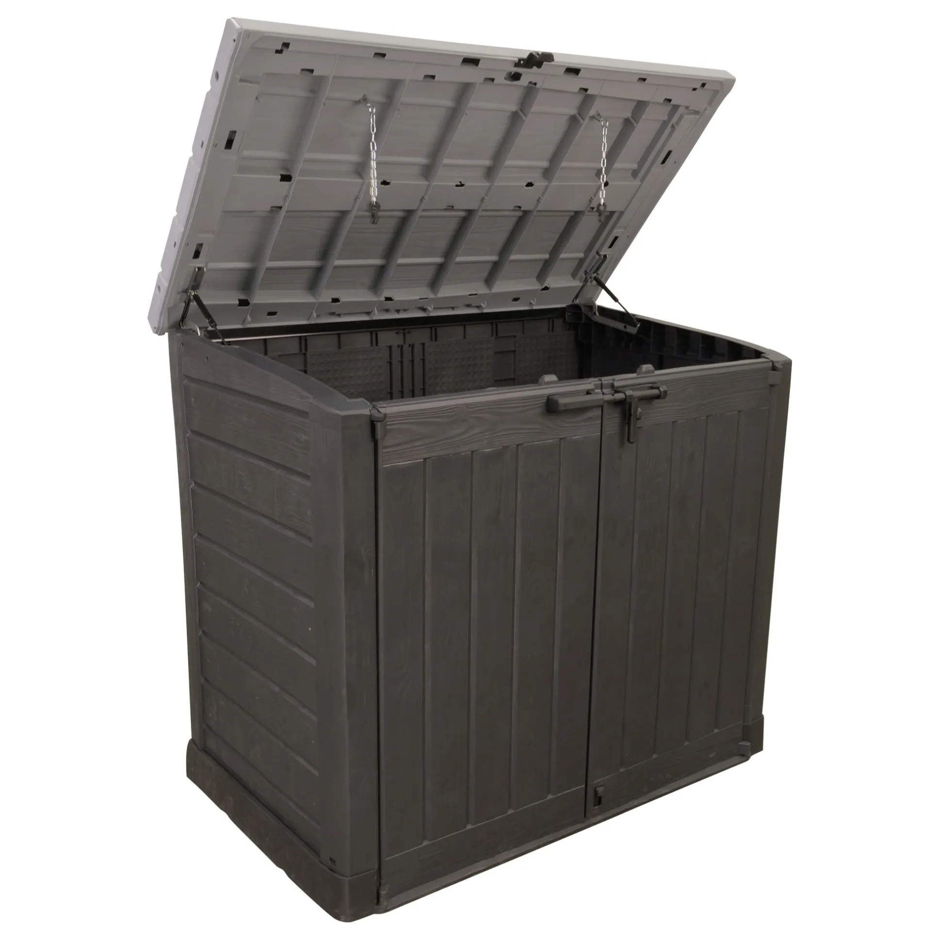 Het is een handige tuinbox voor het opbergen van containers, barbecuespullen of andere tuinaccessoires. De box is gemakkelijk te openen en te sluiten met twee openslaande deuren en een deksel voorzien van handige gasveren. Ook zitten er aan de binnenkant van de deksel twee haken die aan de deksel van de container kunnen worden bevestigd. Hierdoor wordt het deksel van de container onmiddellijk geopend.