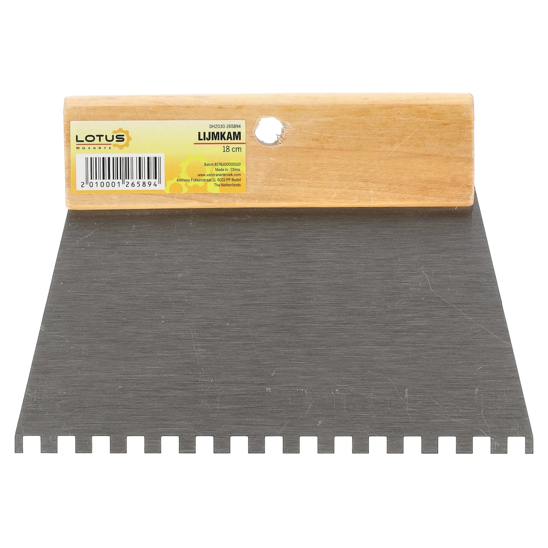 De Lotus lijmkam 18 cm met inkepingen helpt bij het gelijkmatig aanbrengen van lijm op verschillende oppervlakken. Hij is stevig en duurzaam, ideaal voor bouw- en renovatiewerkzaamheden.