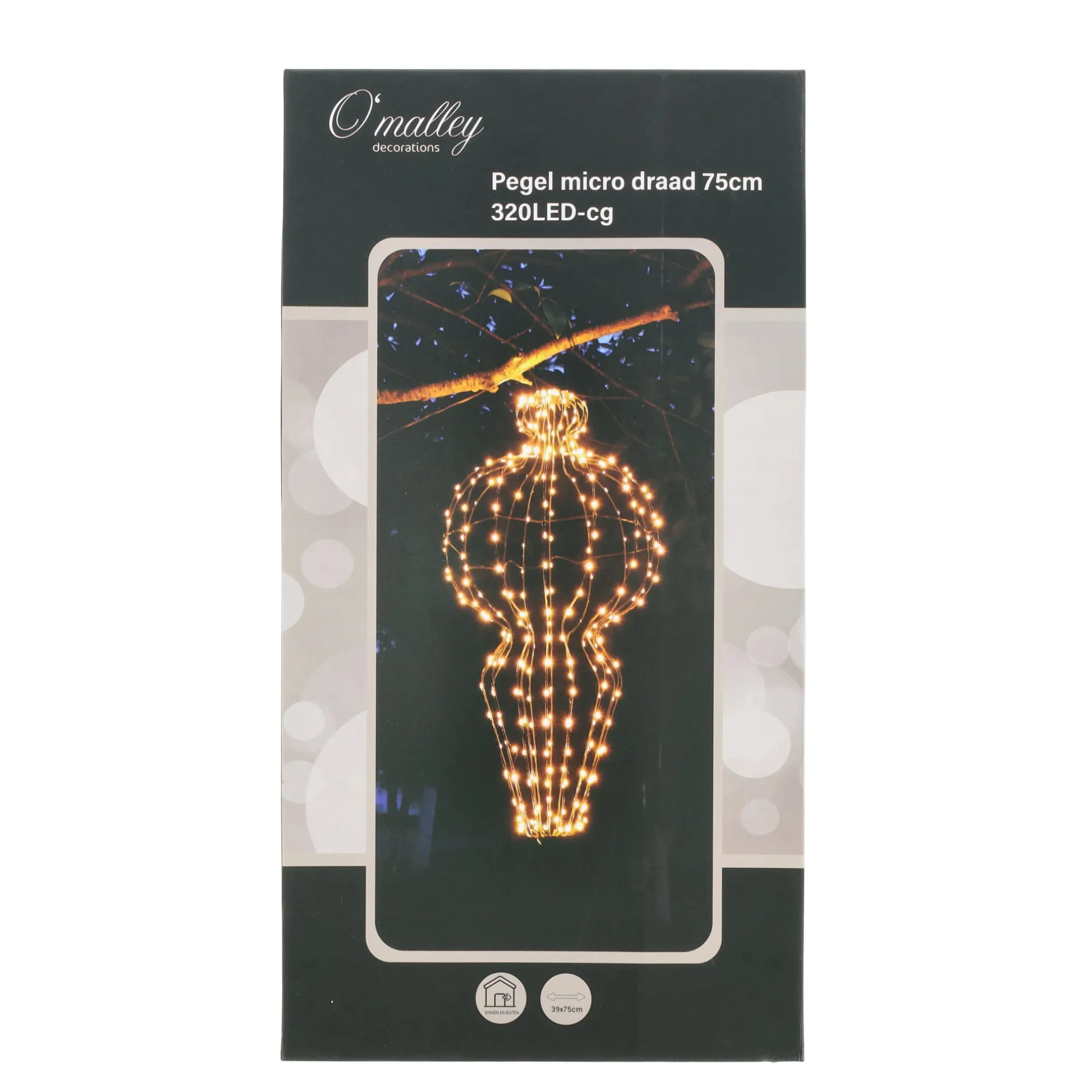 Stijlvolle verlichtingspegel met 320 warmwitte ledlampjes op microdraad. Dankzij het elegante ontwerp en de champagnekleurige afwerking brengt deze decoratie extra sfeer tijdens de feestdagen. Met een hoogte van 75 cm is de pegel perfect voor gebruik aan de gevel, op het terras of in de tuin. De IP44-bescherming maakt hem geschikt voor buitengebruik, terwijl de ledverlichting een warme en gezellige uitstraling geeft.