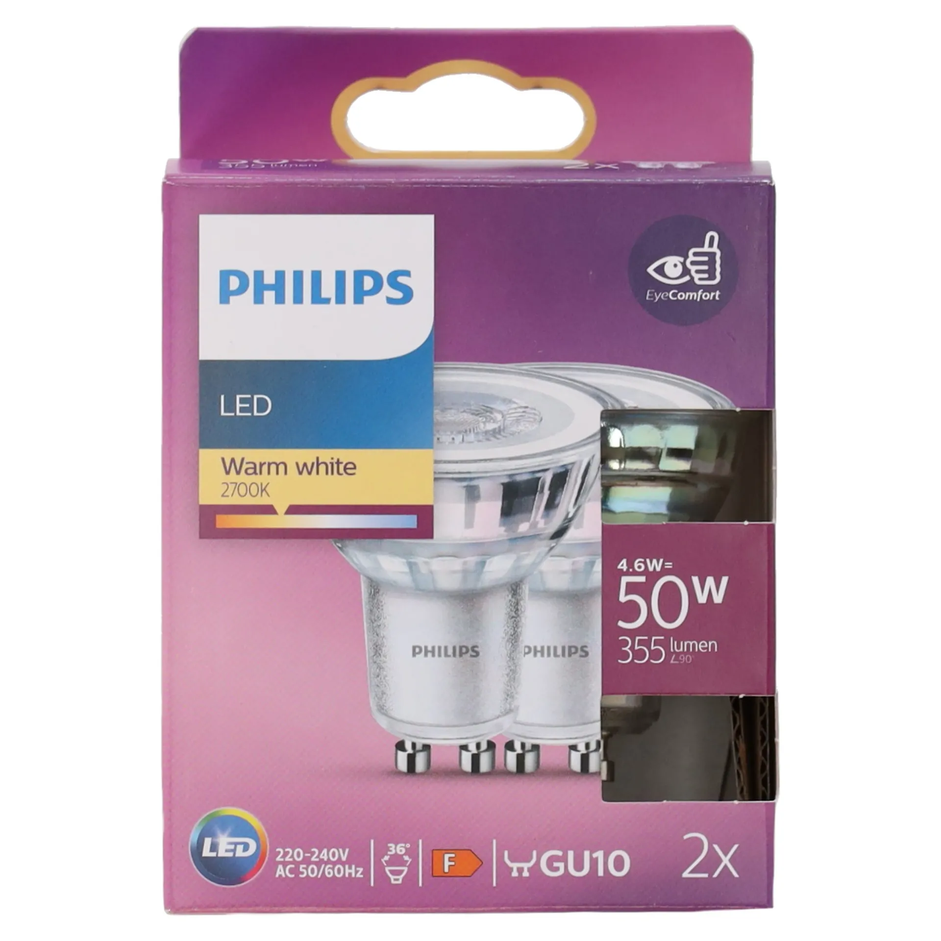 Philips LED-spot met GU10-fitting. De lamp biedt 355 lumen met een verbruik van 4.6 watt. Met warmwit licht (2700K) en EyeComfort-technologie is deze energiezuinige lamp perfect voor inbouw- en opbouwspots. Gaat tot tien keer langer mee dan traditionele lampen.