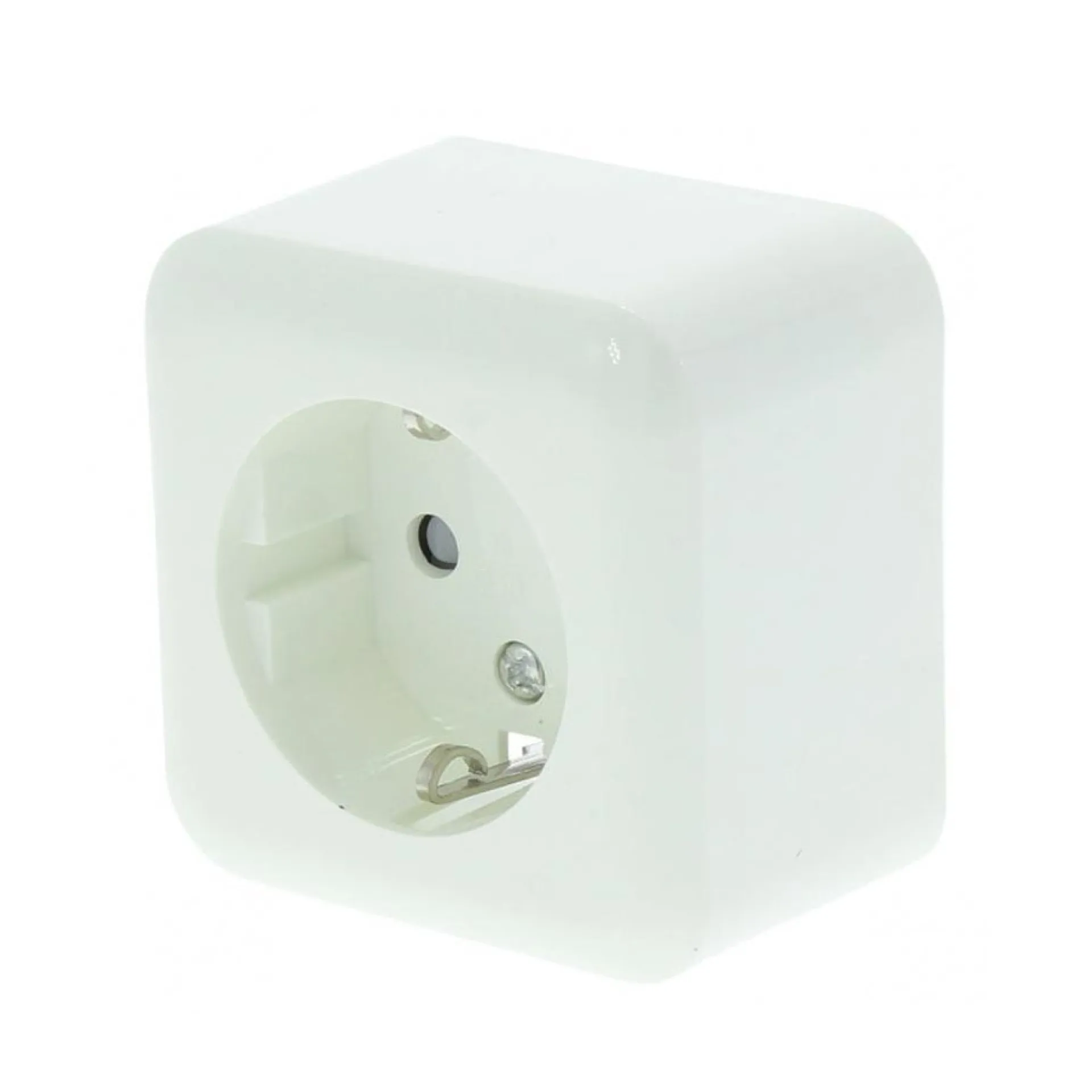 Witte opbouwcontactdoos met randaarde en klapdeksel. Spatwaterdicht (IP44), geschikt voor buiten of vochtige ruimtes.