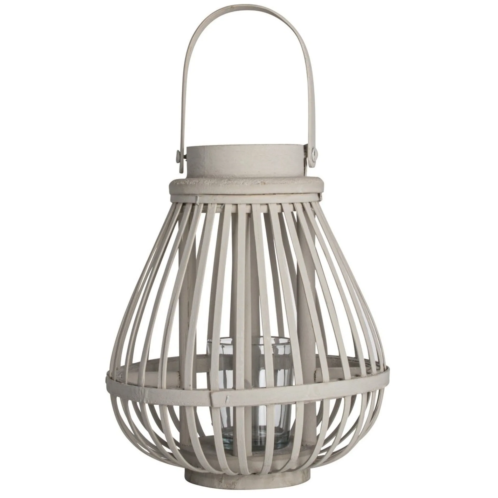 Decoratieve lantaarn met een open frame van lichtgekleurde houten latjes. De vorm is bol en loopt naar boven toe smaller uit. Binnenin staat een losse cilindervormige glazen theelichthouder. Het geheel heeft een rustige, landelijke uitstraling en is geschikt als staand of hangend object.