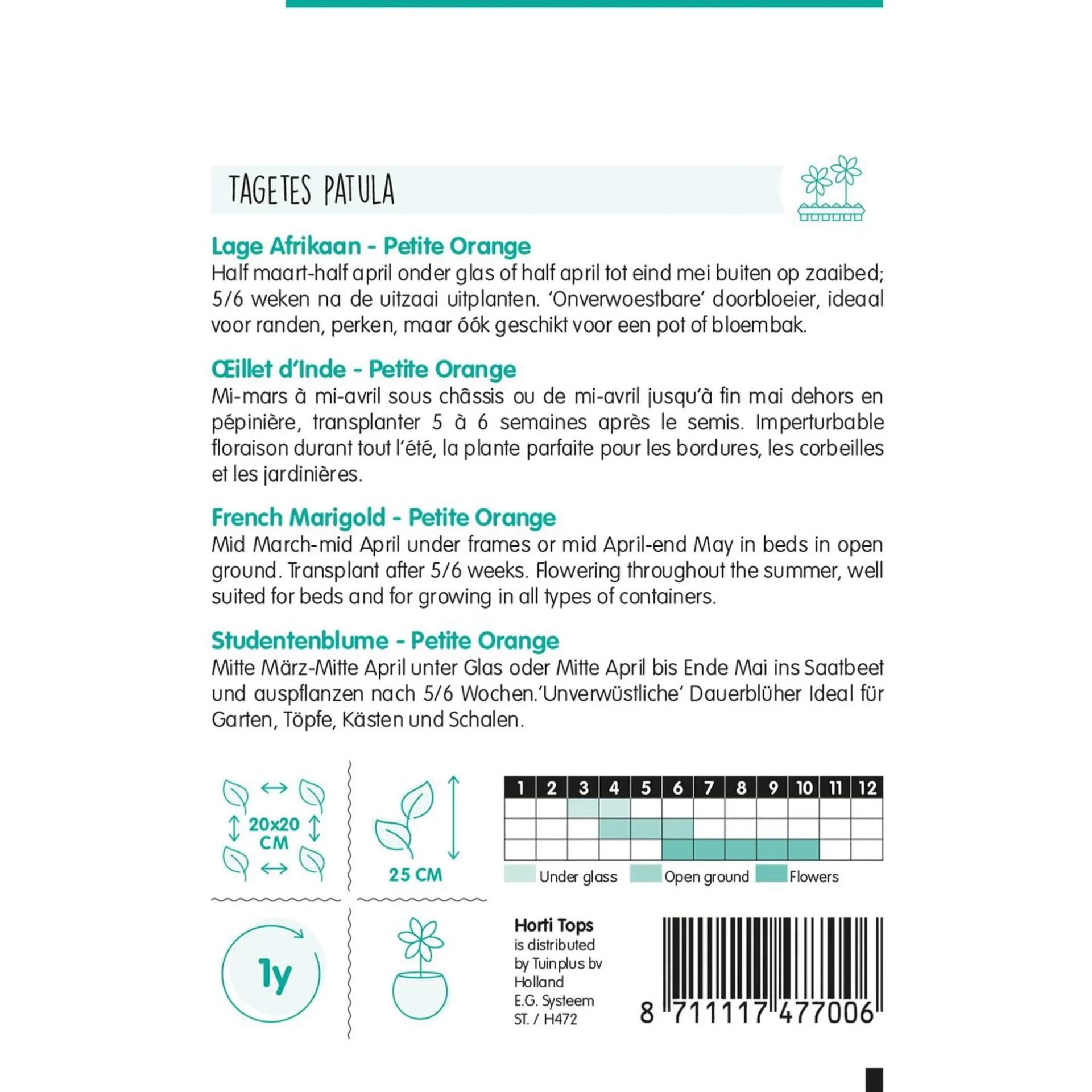 Een compacte plant met heldere oranje bloemen, ideaal voor borders, bloembedden en potten. Gemakkelijk te kweken en biedt langdurige bloei. Tagetesplanten (Afrikaantjes) staan erom bekend dat zij schadelijke insecten op afstand houden, terwijl ze nuttige bijen en vlinders aantrekken. Een uitstekende keuze voor een kleurrijke tuin.