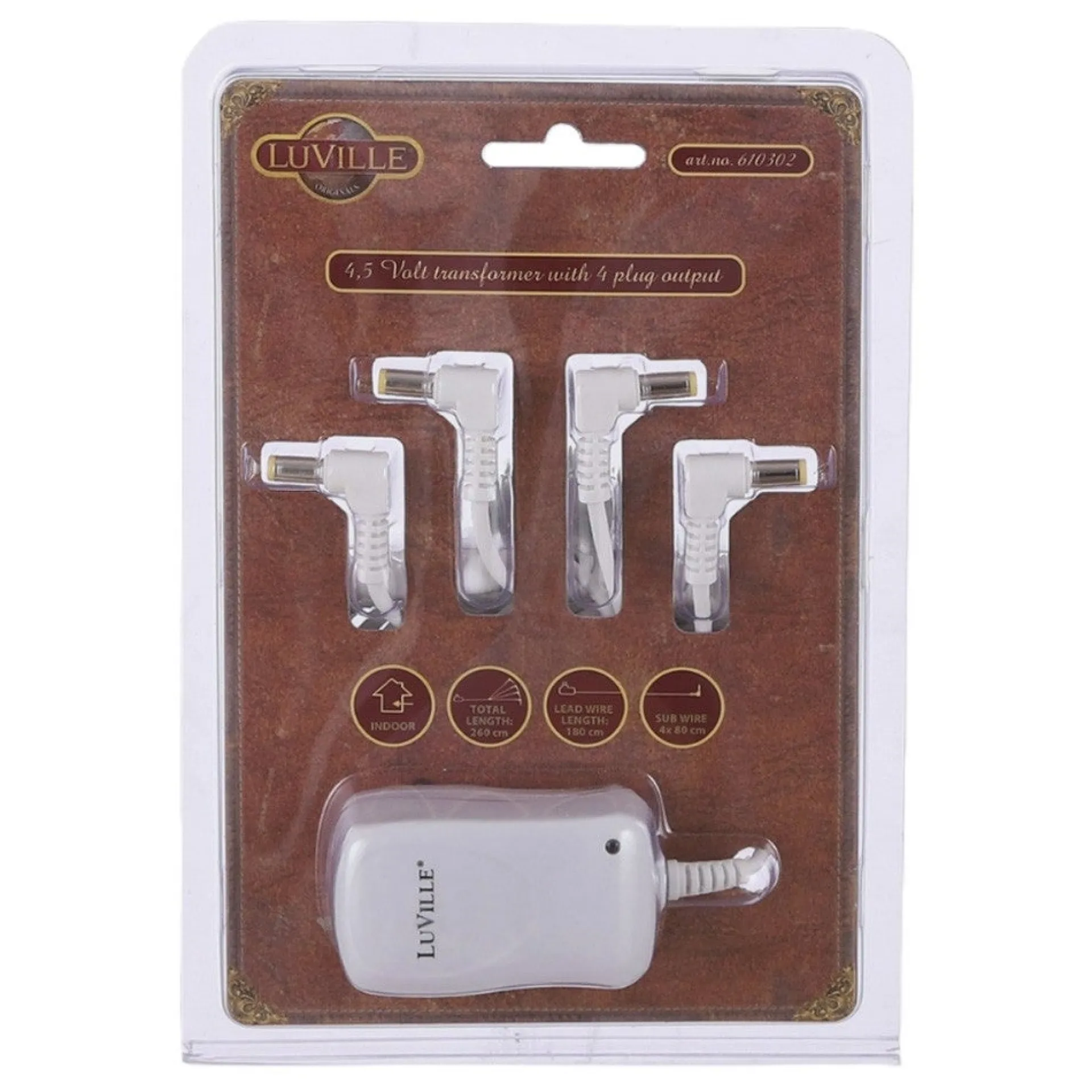 Deze 4,5 volt transformator is geschikt voor gebruik binnenshuis en heeft een 4-voudige uitgang, zodat je over vier aansluitingen tegelijk beschikt. Hiermee sluit je eenvoudig meerdere 4,5 volt aansluitingen aan vanaf één adapter.