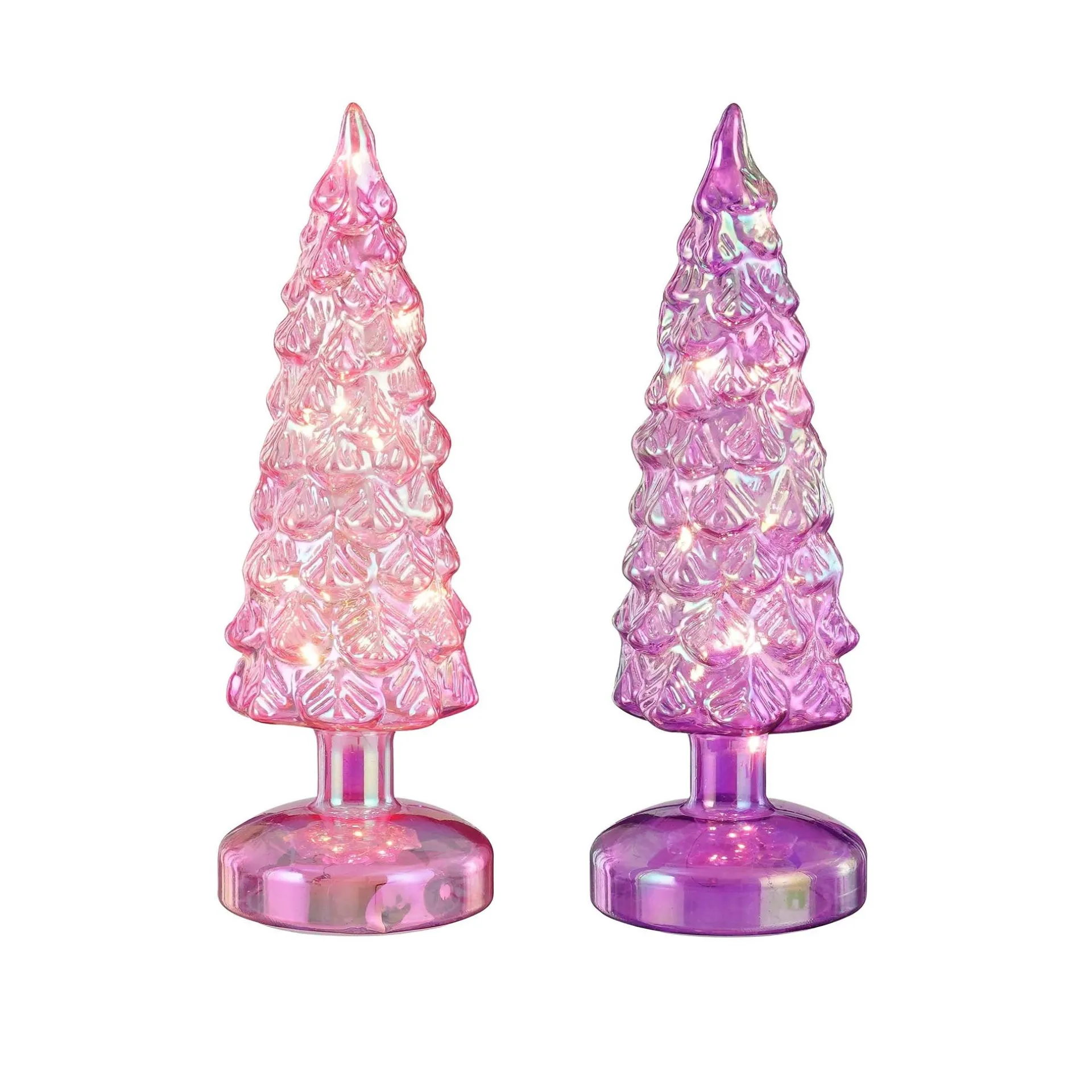 Glazen decoratieboompjes voorzien van LED-verlichting. Een sfeervolle en stijlvolle lichtbron voor je kerstinterieur, verkrijgbaar in roze en lila.