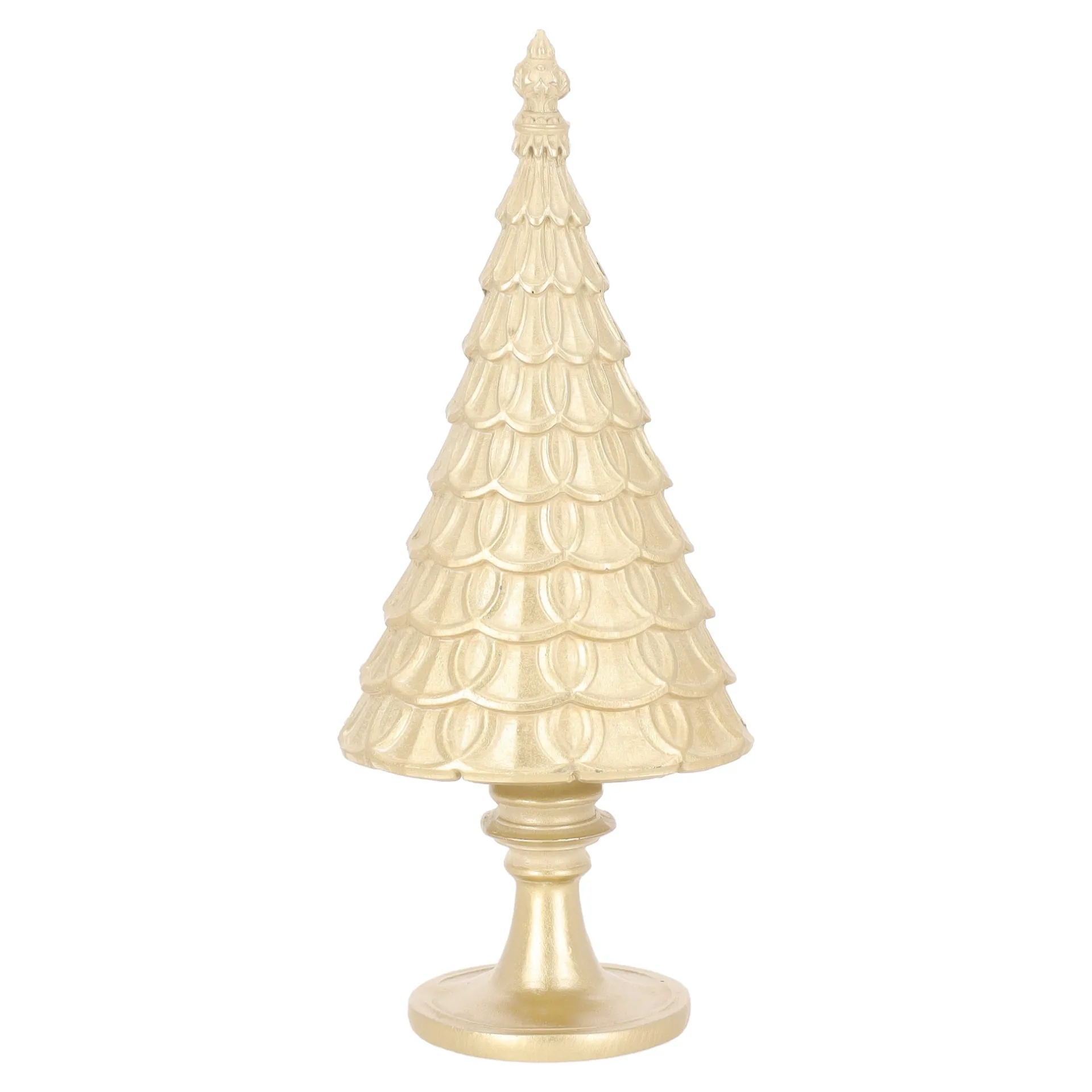 Deze decoratieve kerstboom in een glanzende goudkleur is een stijlvolle toevoeging aan elk interieur. De boom staat op een stevige voet en heeft een decoratief reliƫf dat zorgt voor een luxe uitstraling. Met een hoogte van ongeveer 24 cm is hij perfect om op een tafel, kast of vensterbank te plaatsen.