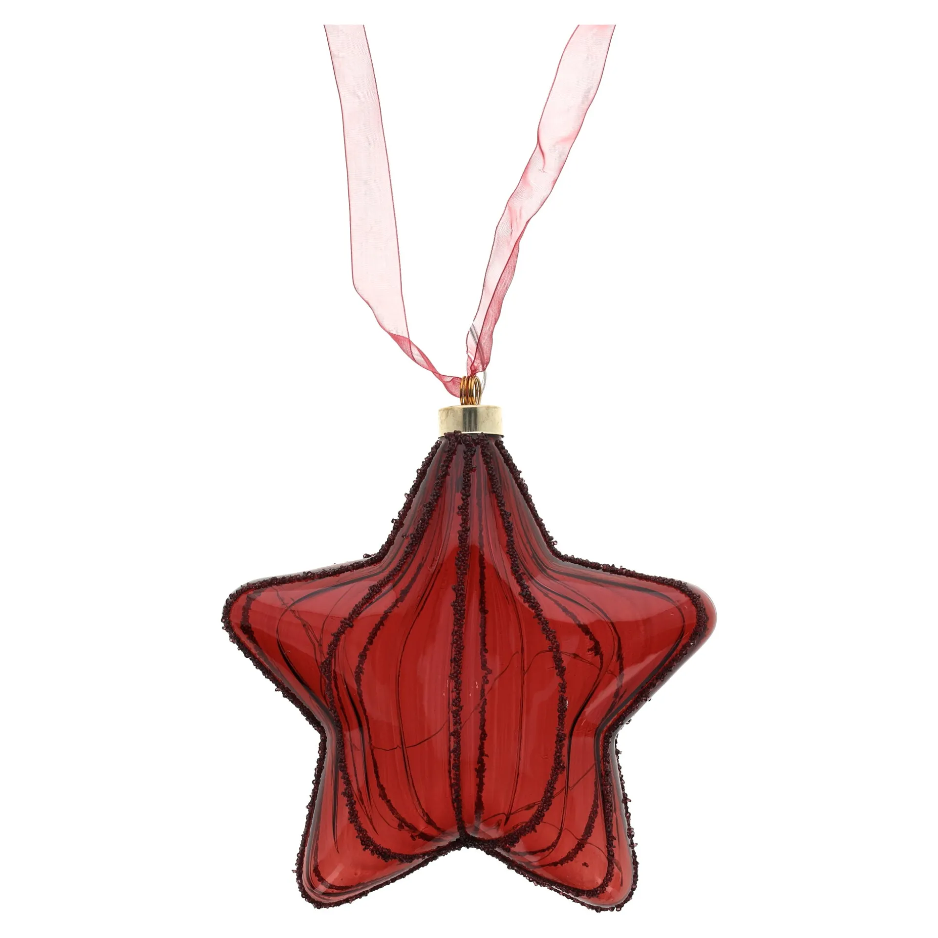Deze glazen kerstster in bordeauxrood heeft een sierlijke vorm en is afgewerkt met een bijpassend lint. De ster is ongeveer 20 cm groot en bevat 15 warmwitte ledlampjes, waardoor hij een zacht en sfeervol licht verspreidt wanneer je hem ophangt. Een stijlvolle toevoeging aan je kerstdecoratie.