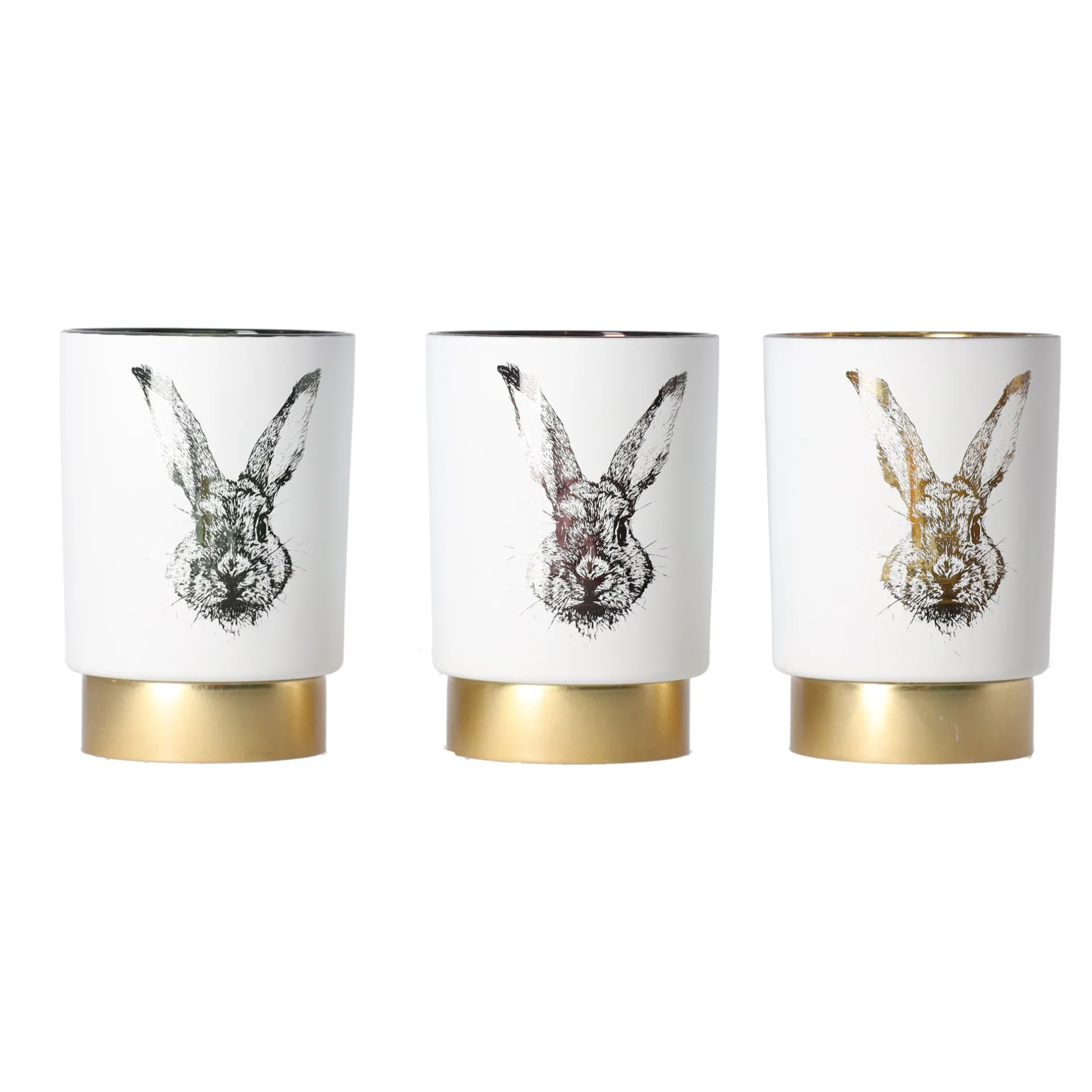 Stijlvolle houder voor waxinelichtjes met een konijn design, verkrijgbaar in drie verschillende uitvoeringen.