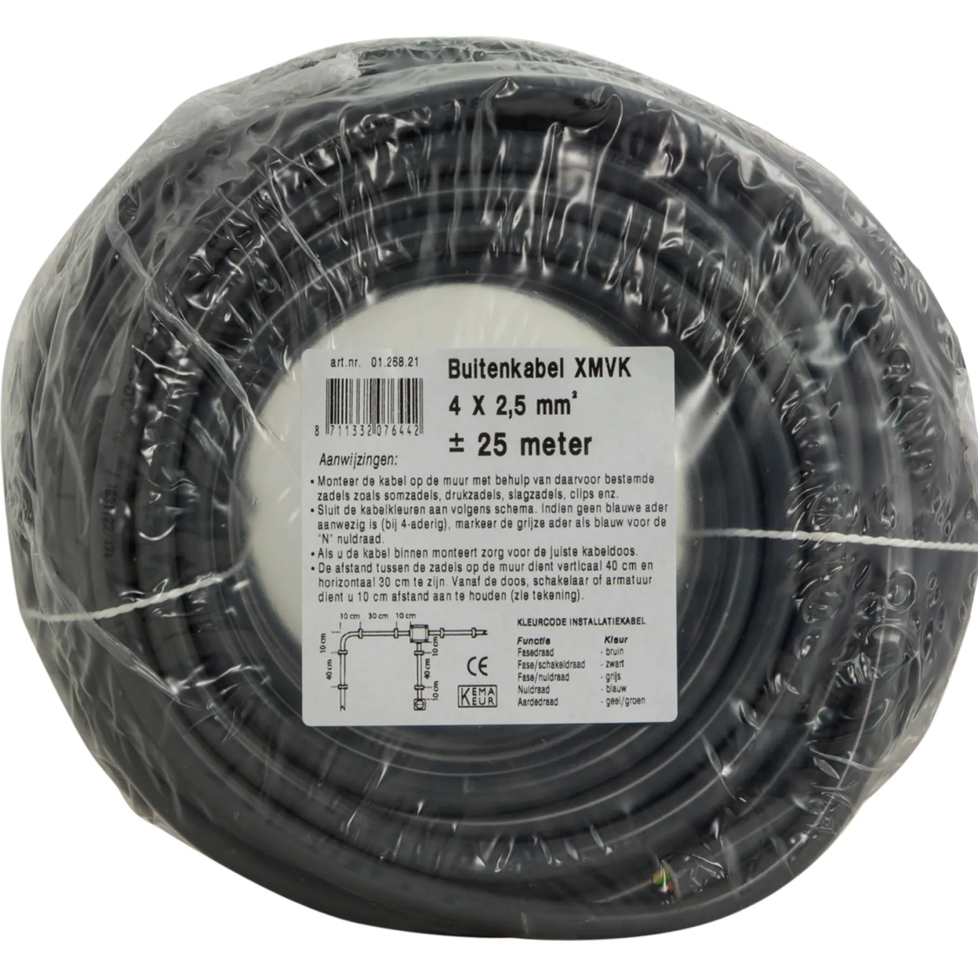 Buitenkabel type XMVK met vier massieve koperen aders van 2,5 mm². Voorzien van een grijze PVC-mantel en kleurgecodeerde aders. Levering op rol van 25 meter en geschikt voor vaste elektrische installaties. Monteer de kabel op de muur met behulp van de daarvoor bestemde zadels. Bij montage binnenshuis, zorgt u voor de juiste kabeldoos.