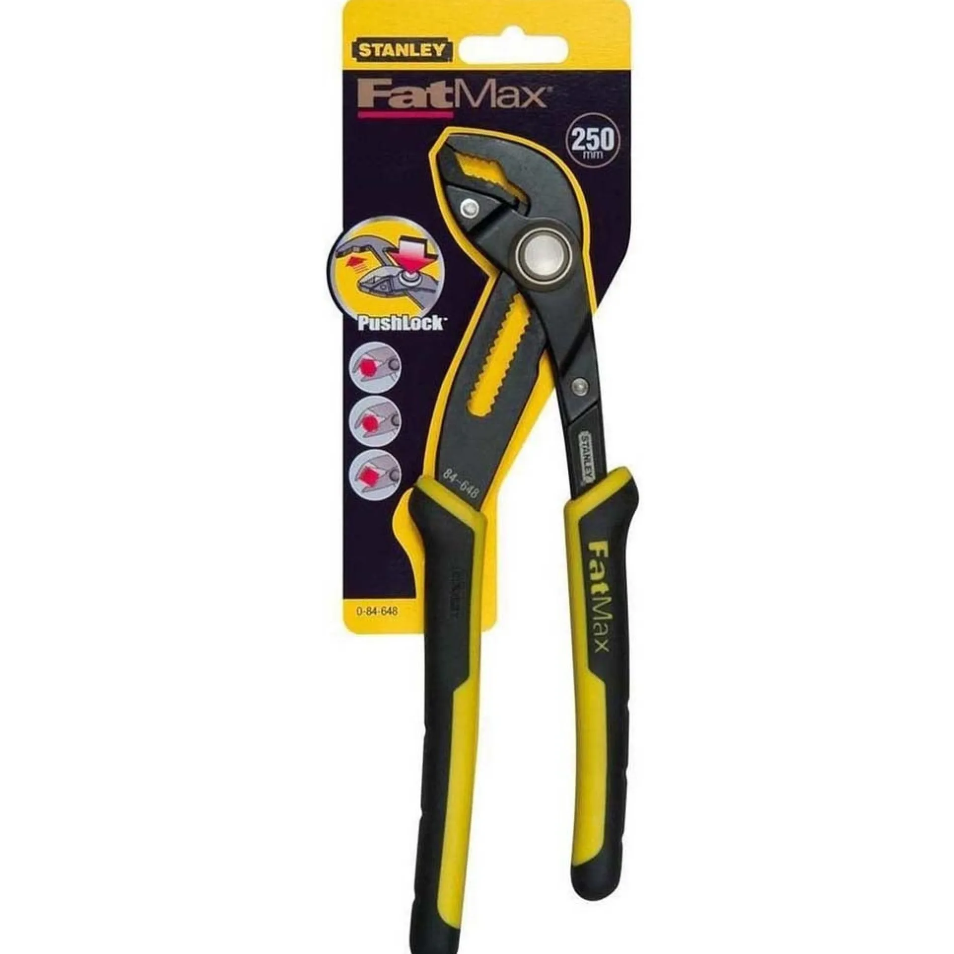 De Stanley FatMax Pushlock waterpomptang (0-84-648) is ideaal voor uiteenlopende klussen in en rondom het huis. Dankzij de ergonomische bi-materialen handgrepen ligt de tang prettig in de hand. Met de pushlock-drukknop kunt u de benen in 17 posities verstellen met slechts één druk op de knop. Het inductie geharde bekken geeft optimale grip en de smalle kop maakt het mogelijk om ook in moeilijk bereikbare plaatsen te werken. Het bekken heeft een variabele capaciteit van 62 tot 250mm. De tang zelf is 254mm lang, weegt 380gram en heeft een binnenbekbreedte van 51mm.