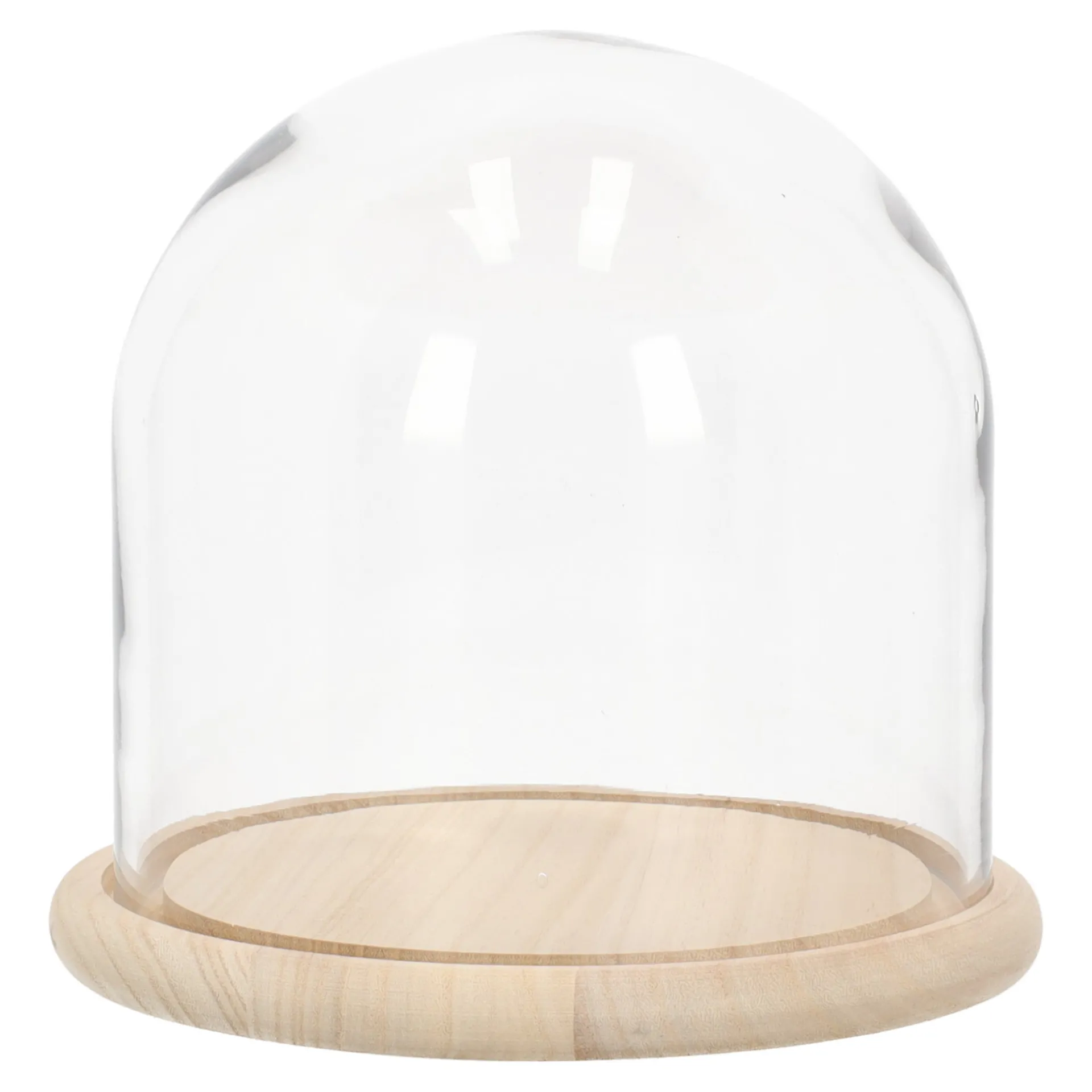 Glazen stolp met naturel houten onderkant. Ideaal om decoraties, planten of kleine accessoires stijlvol te presenteren.