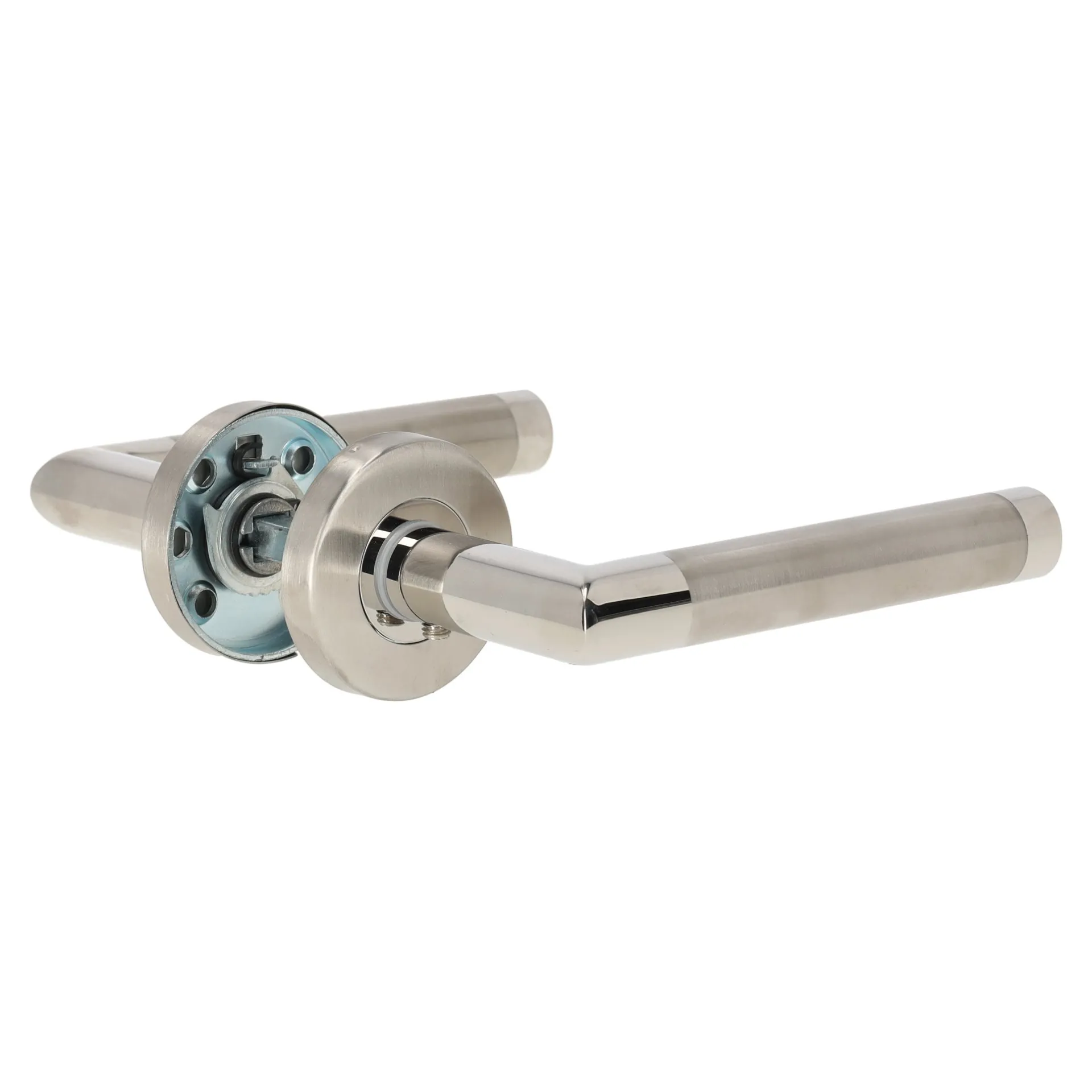 Deurkruk set Cromer van rvs, geschikt voor binnendeuren met een deurdikte van 38–45 mm. De set wordt compleet geleverd met ronde rozetten, metalen as en bevestigingsmateriaal, zodat je de deurkrukken eenvoudig kunt monteren op deuren met of zonder slot.