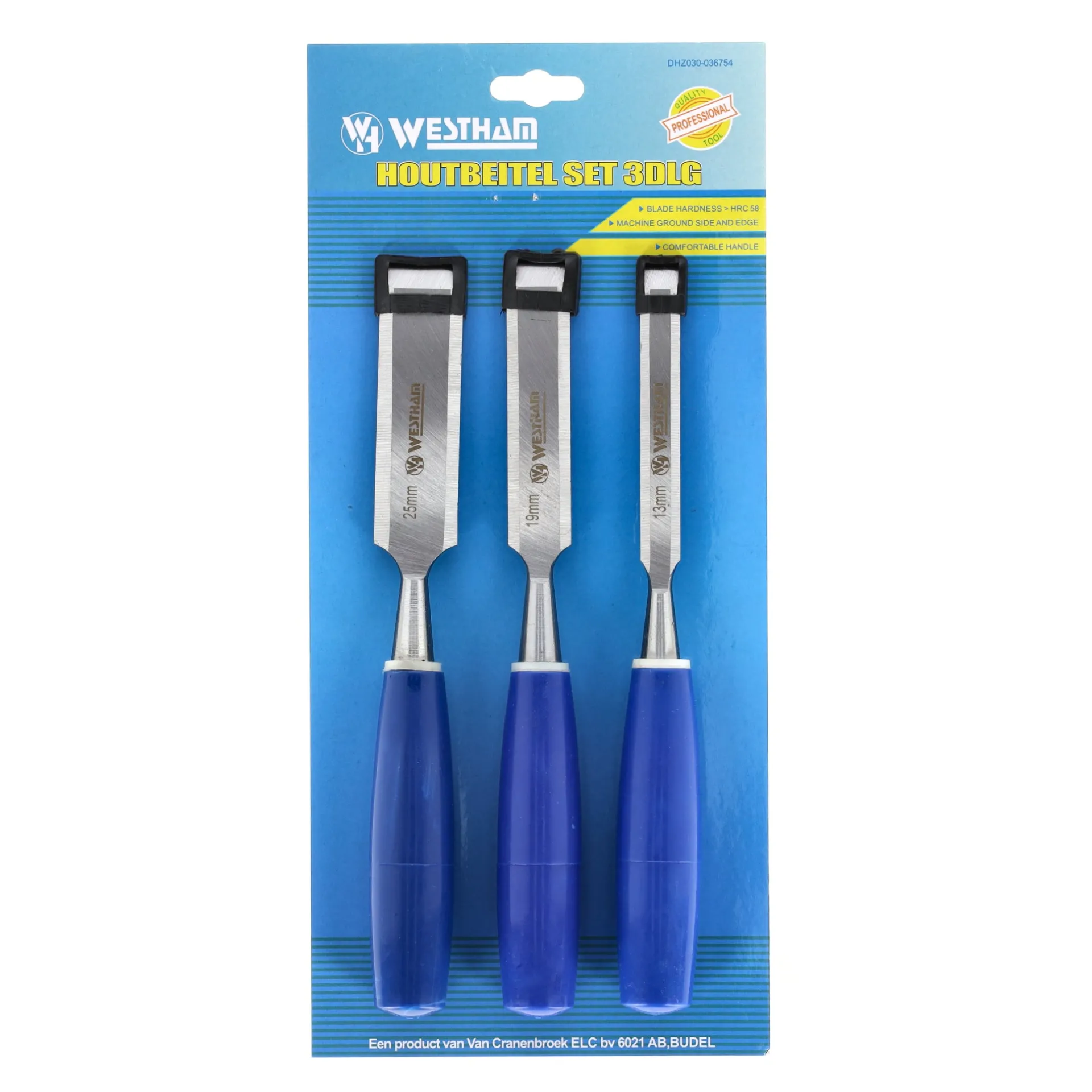 De set bevat drie beitels van verschillende maten voor nauwkeurig en comfortabel houtbewerken. De gereedschappen zijn gemaakt van hoogwaardig staal en hebben ergonomische handgrepen voor een stevige grip en comfortabel gebruik. Geschikt voor timmerlieden, houtbewerkers en doe-het-zelvers.