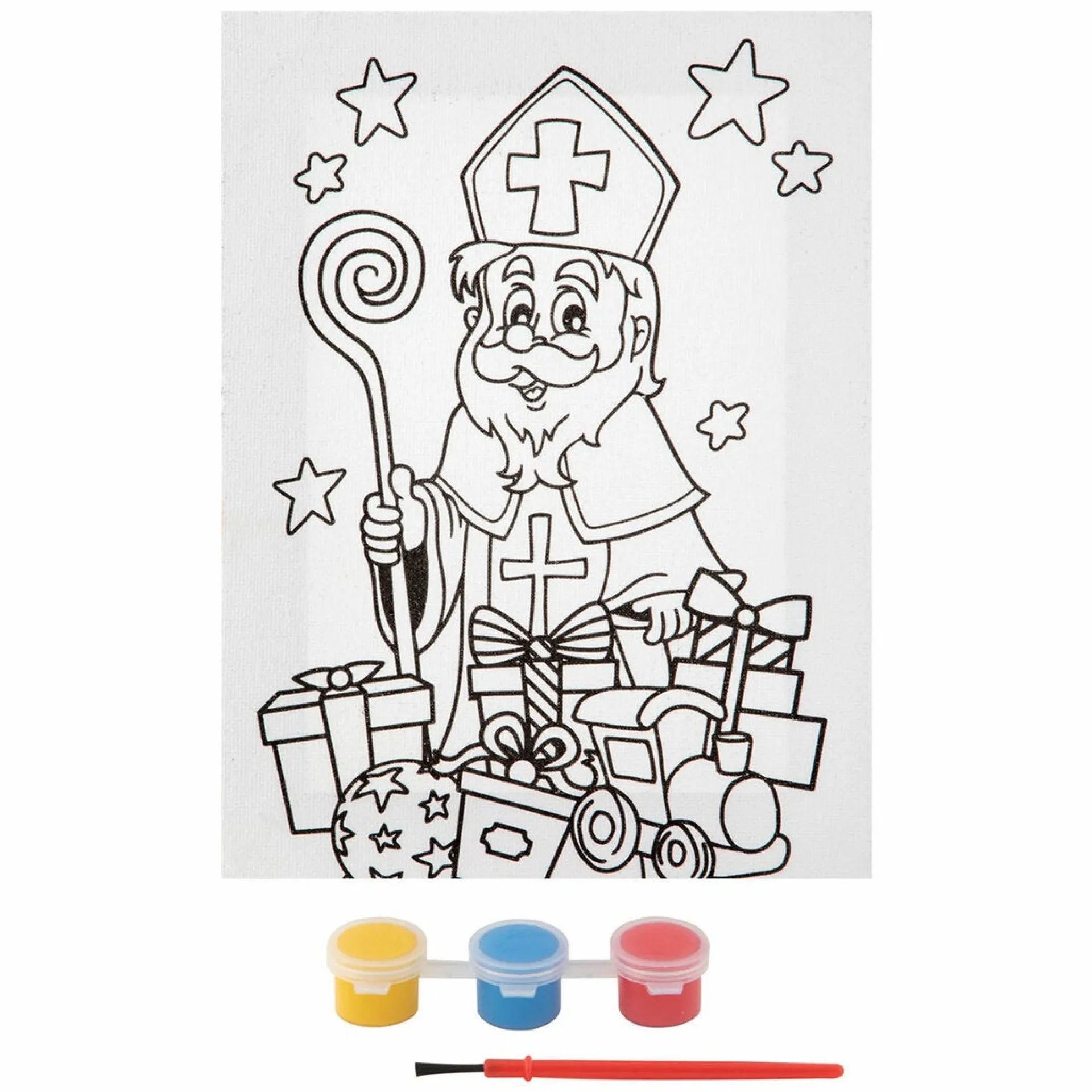 Schilder je eigen canvas met een vrolijke afbeelding van Sinterklaas. De set bevat een canvas met voorgetekende lijnen, drie verfkleuren en een penseel. Ideaal voor creatieve kinderen tijdens het Sinterklaasfeest.
