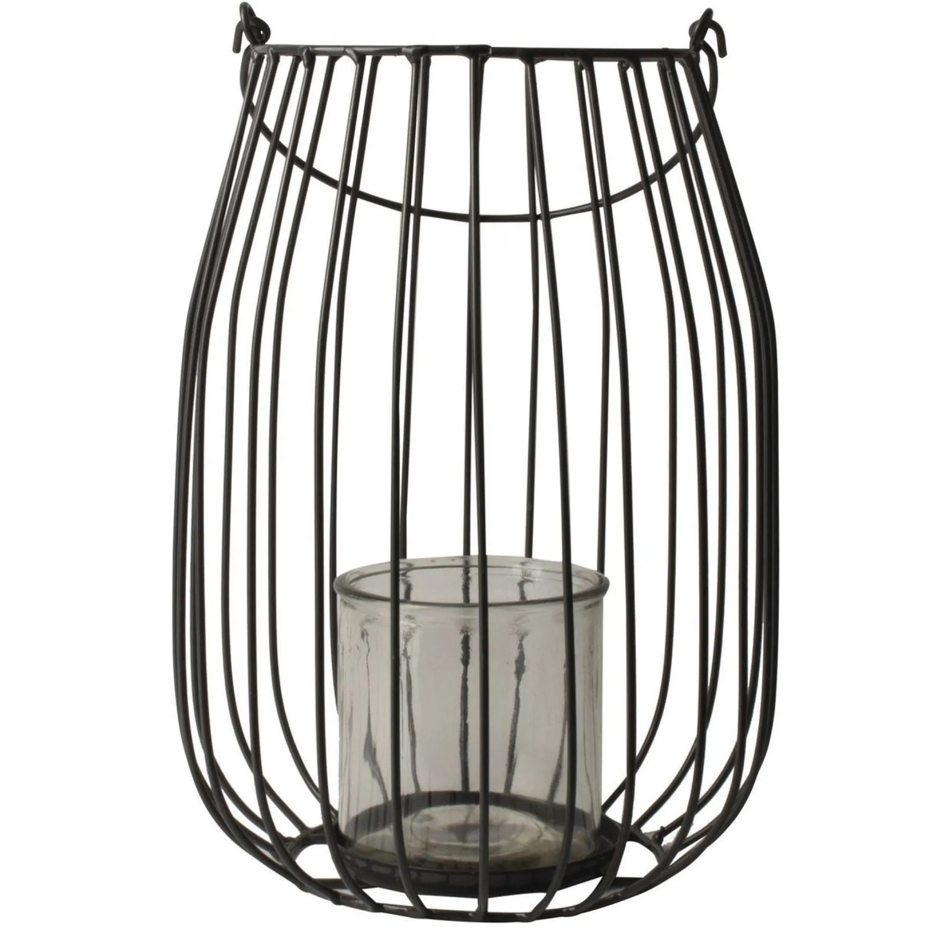 Decoratieve lantaarn met een open metalen frame met verticale spijlen en een licht taps toelopende, ronde vorm. Binnenin staat een losse cilindervormige glazen theelichthouder. Het geheel heeft een stoere, industriƫle uitstraling en is geschikt als staand of hangend object.