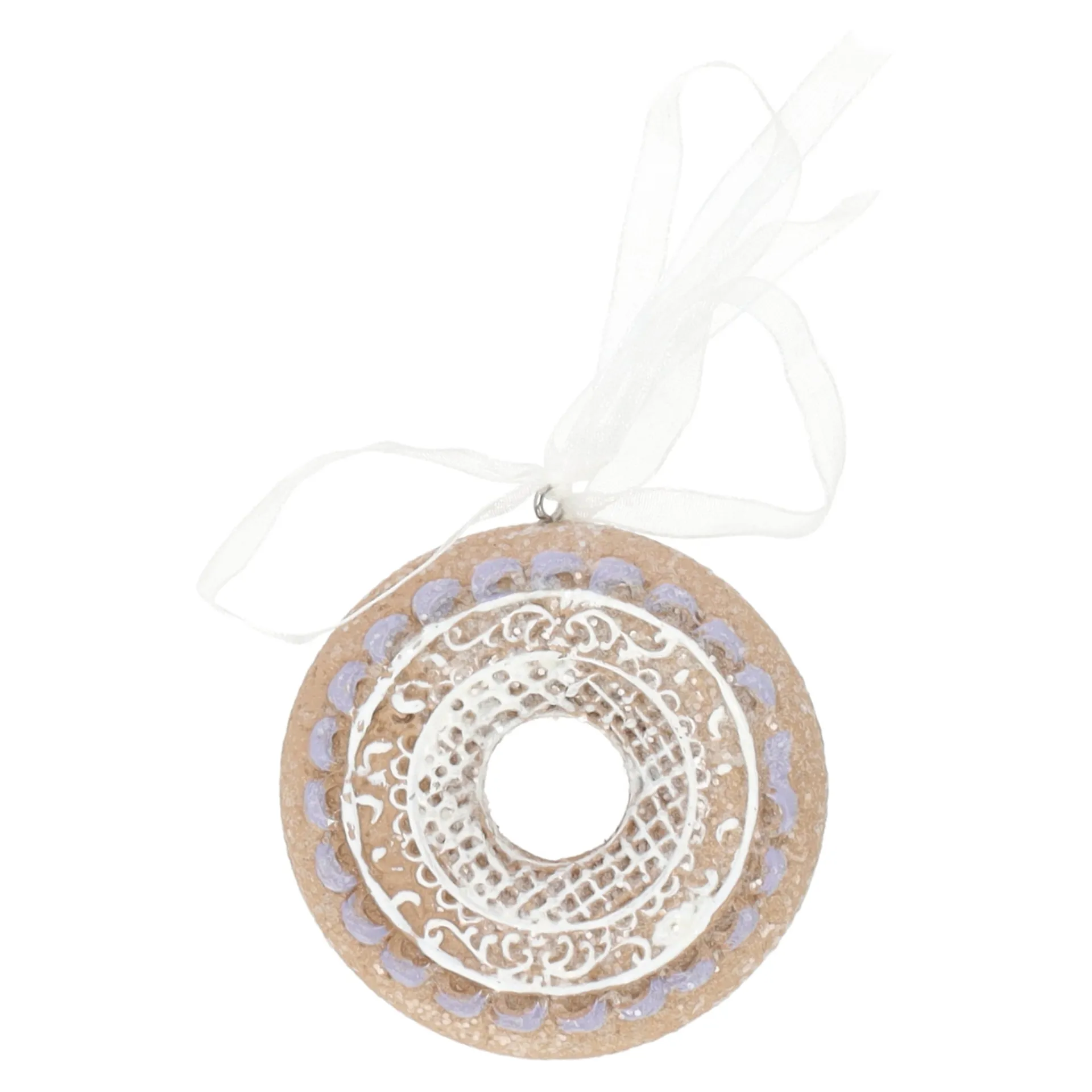 Kersthanger in de vorm van een donut met een gingerbread-uitstraling. De hanger heeft sierlijke details in pastelkleuren en een wit lint om op te hangen.