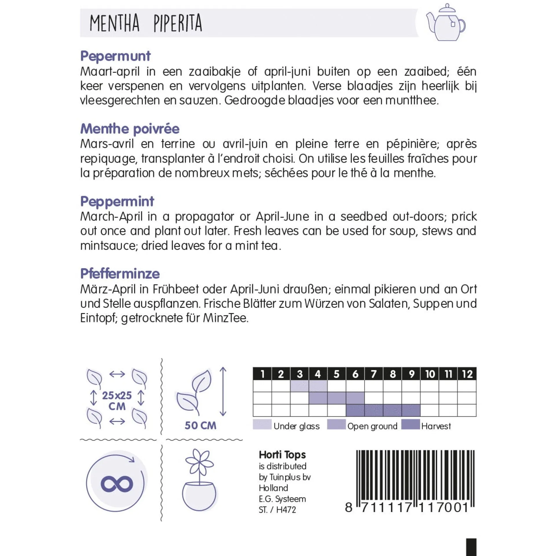 Maart-april in een zaaibakje of april-juni buiten op een zaaibed; één keer verspenen en vervolgens uitplanten. Verse blaadjes zijn heerlijk bij vleesgerechten en sauzen, maar ook voor de bereiding van muntthee.