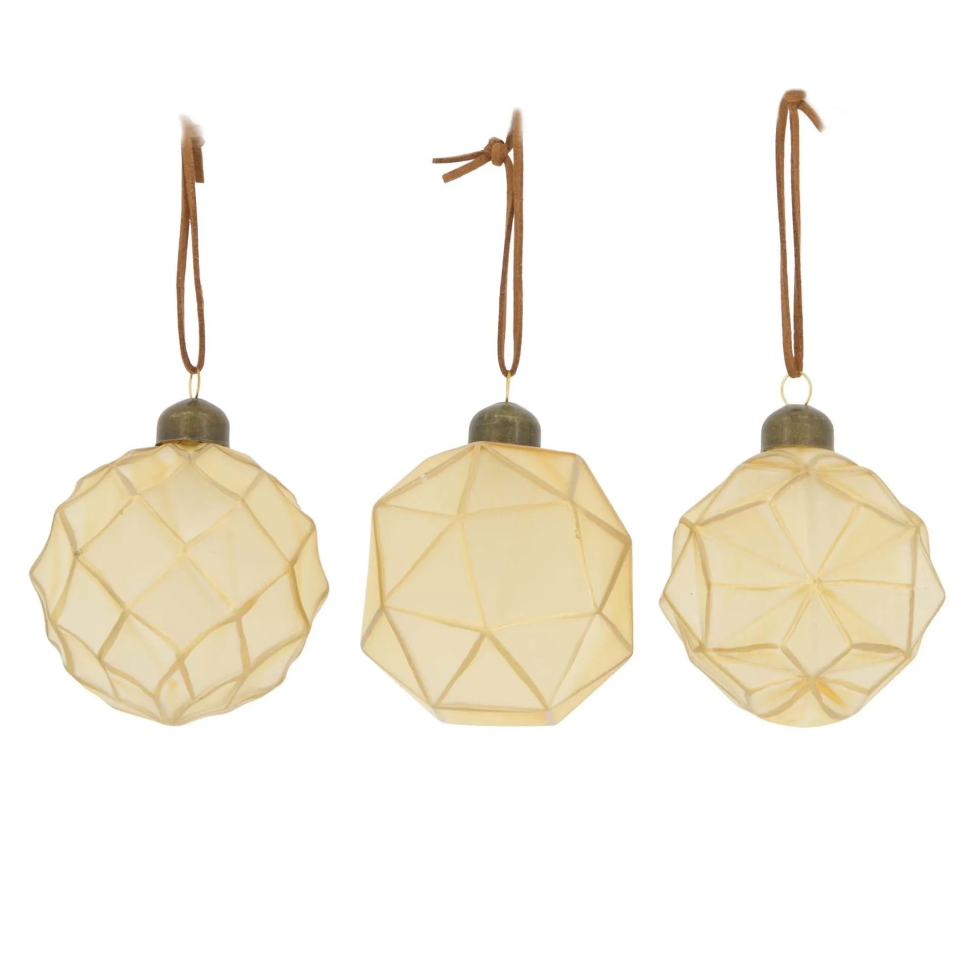 Glazen kerstbal met decoratief design en luxe uitstraling, verkrijgbaar in drie uitvoeringen.