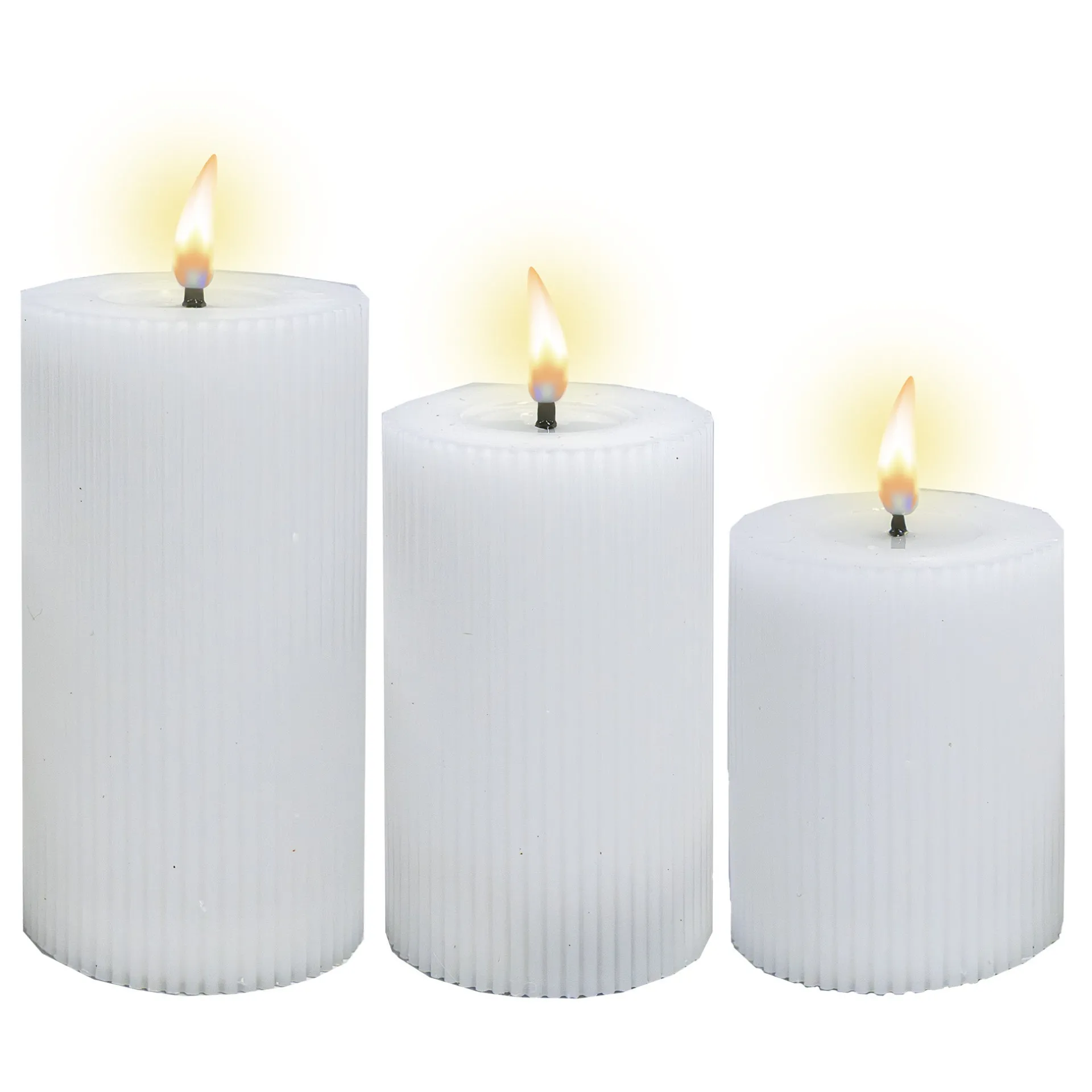 Set van drie LED-kaarsen met ribbelstructuur en ‘melted’ effect. Inclusief afstandsbediening voor eenvoudig gebruik en een warme, sfeervolle gloed.