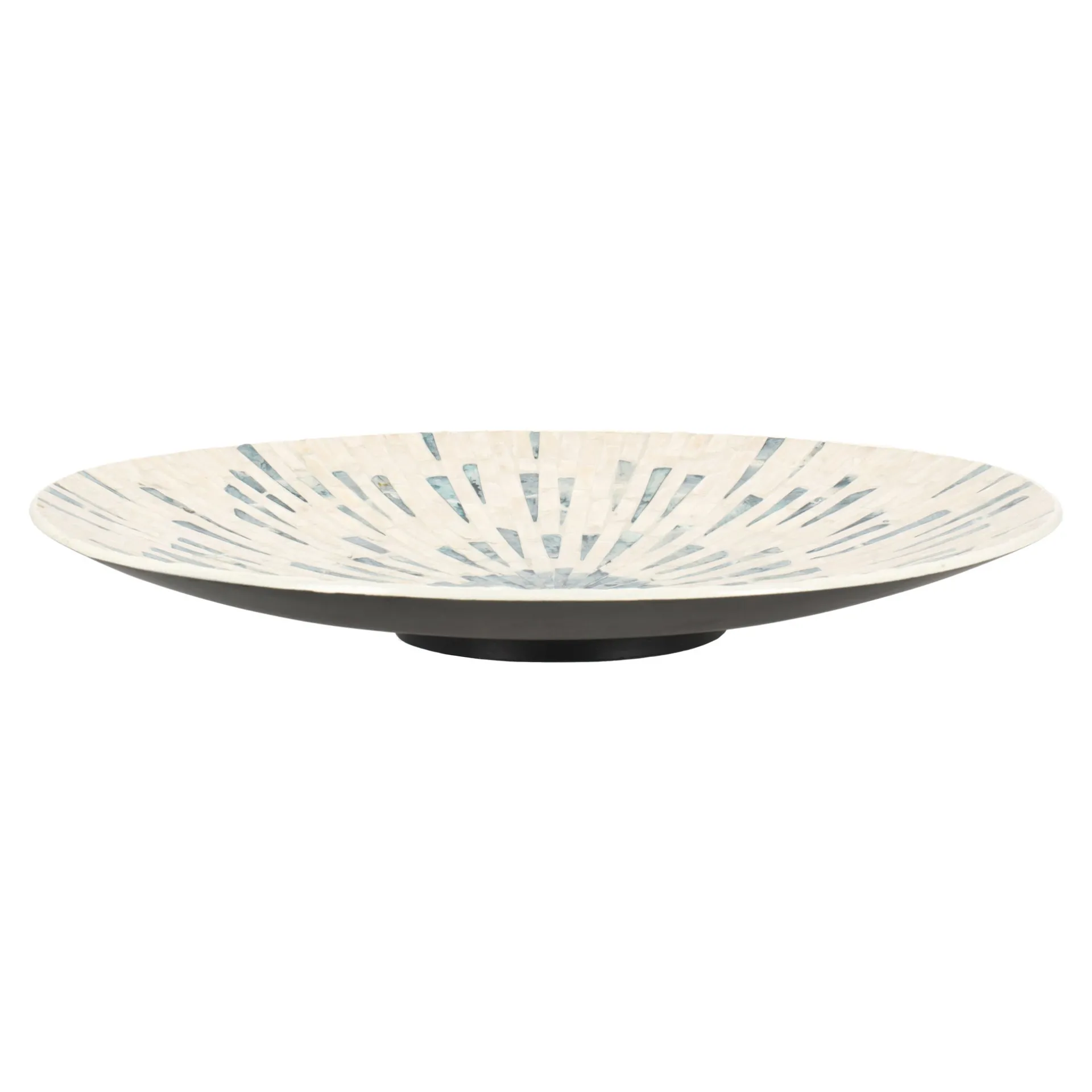 Deze stijlvolle schaal is gemaakt van capiz en heeft een prachtig mozaïekpatroon in witte en blauwgroene tinten. Het glanzende oppervlak zorgt voor een luxe uitstraling die mooi past in elk interieur. Met zijn diameter van 50 cm is de schaal ideaal als decoratief pronkstuk op tafel, dressoir of salontafel. Ook zonder inhoud trekt hij de aandacht door zijn unieke lichteffect en natuurlijke glans.
