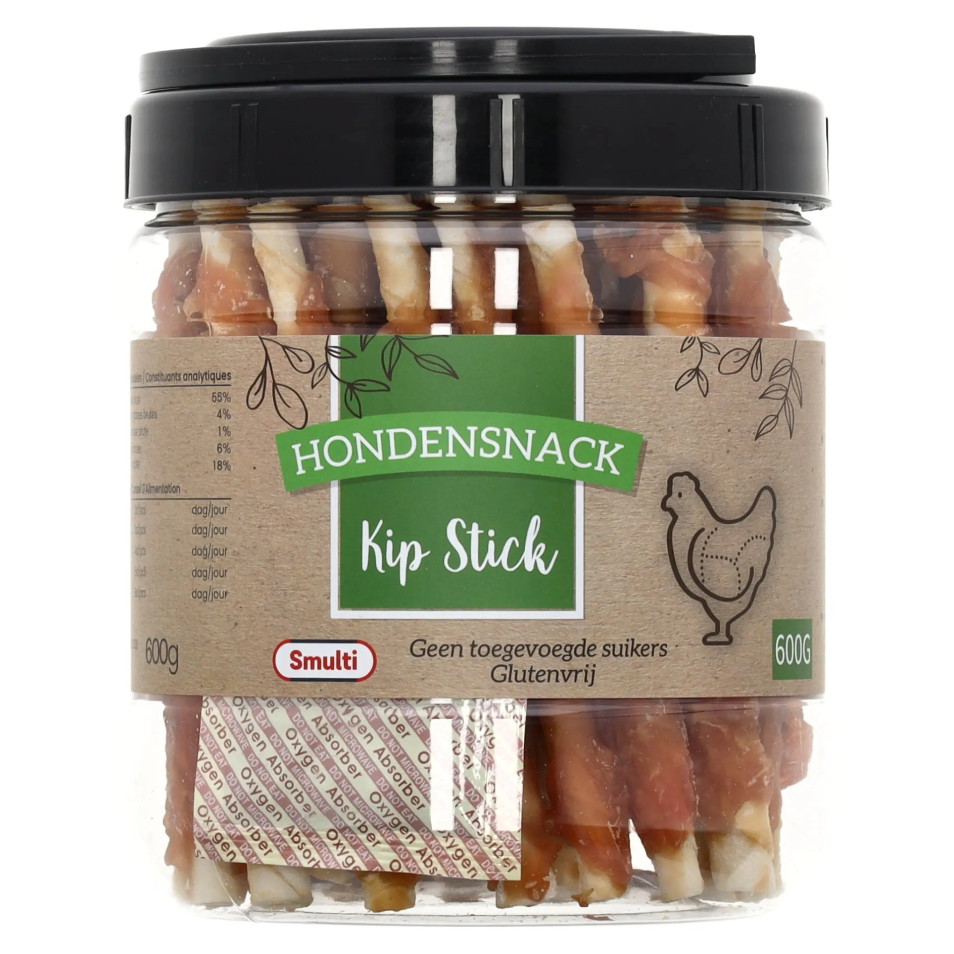 De kip stick voor honden is een smakelijke en voedzame traktatie gemaakt van hoogwaardig kippenvlees. Deze sticks zijn een uitstekende bron van eiwitten en perfect als beloning of als extra traktatie. De verpakking van 600 g maakt dit product handig voor langdurig gebruik. Laat de hond niet alleen met kauwmateriaal. Zorg voor vers water.