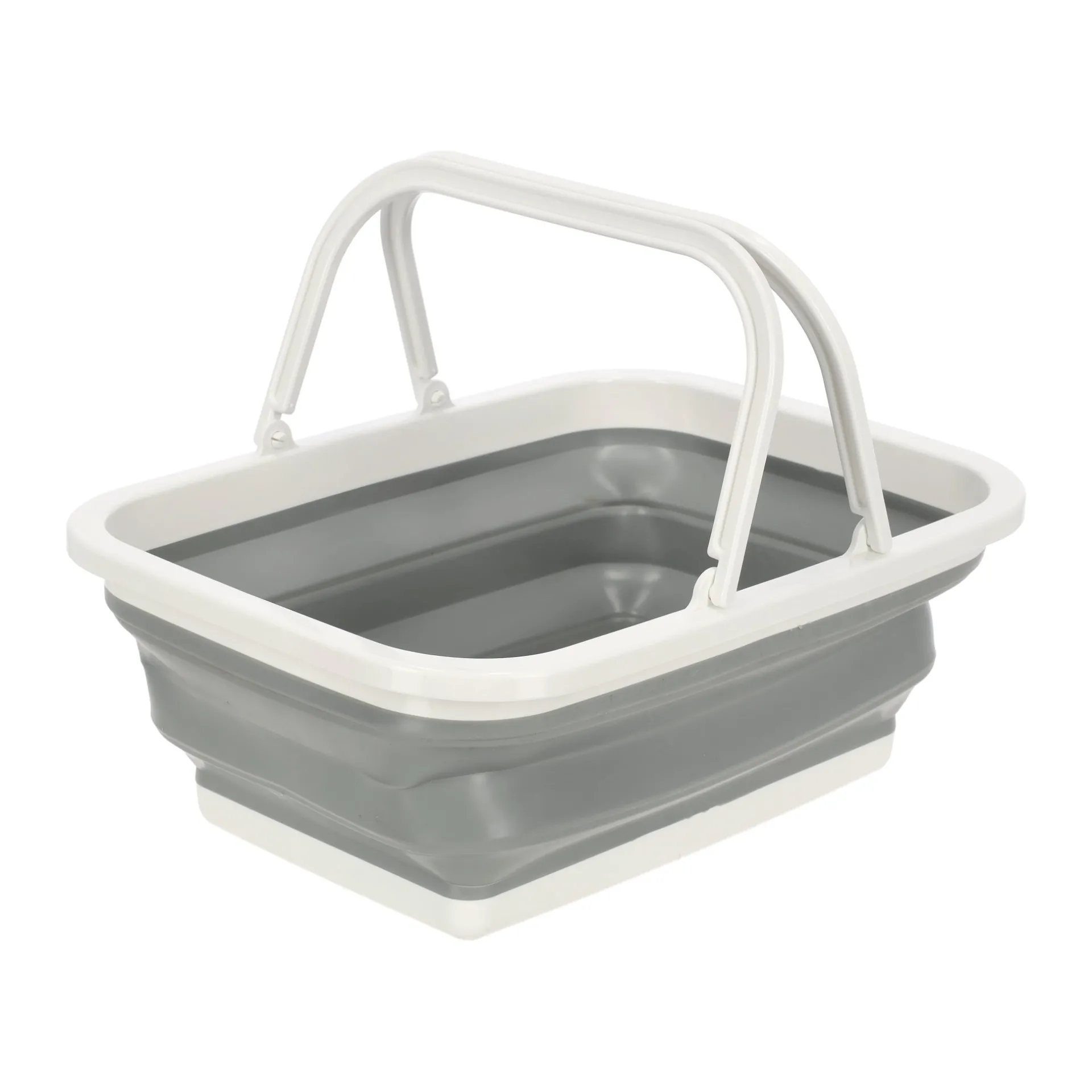 Deze opvouwbare mand is gemaakt van kunststof en heeft flexibele wanden. Dankzij het inklapbare ontwerp neemt de mand weinig ruimte in wanneer hij niet wordt gebruikt. De stevige handgrepen maken het dragen eenvoudig en de mand is geschikt voor het opbergen of vervoeren van verschillende spullen.