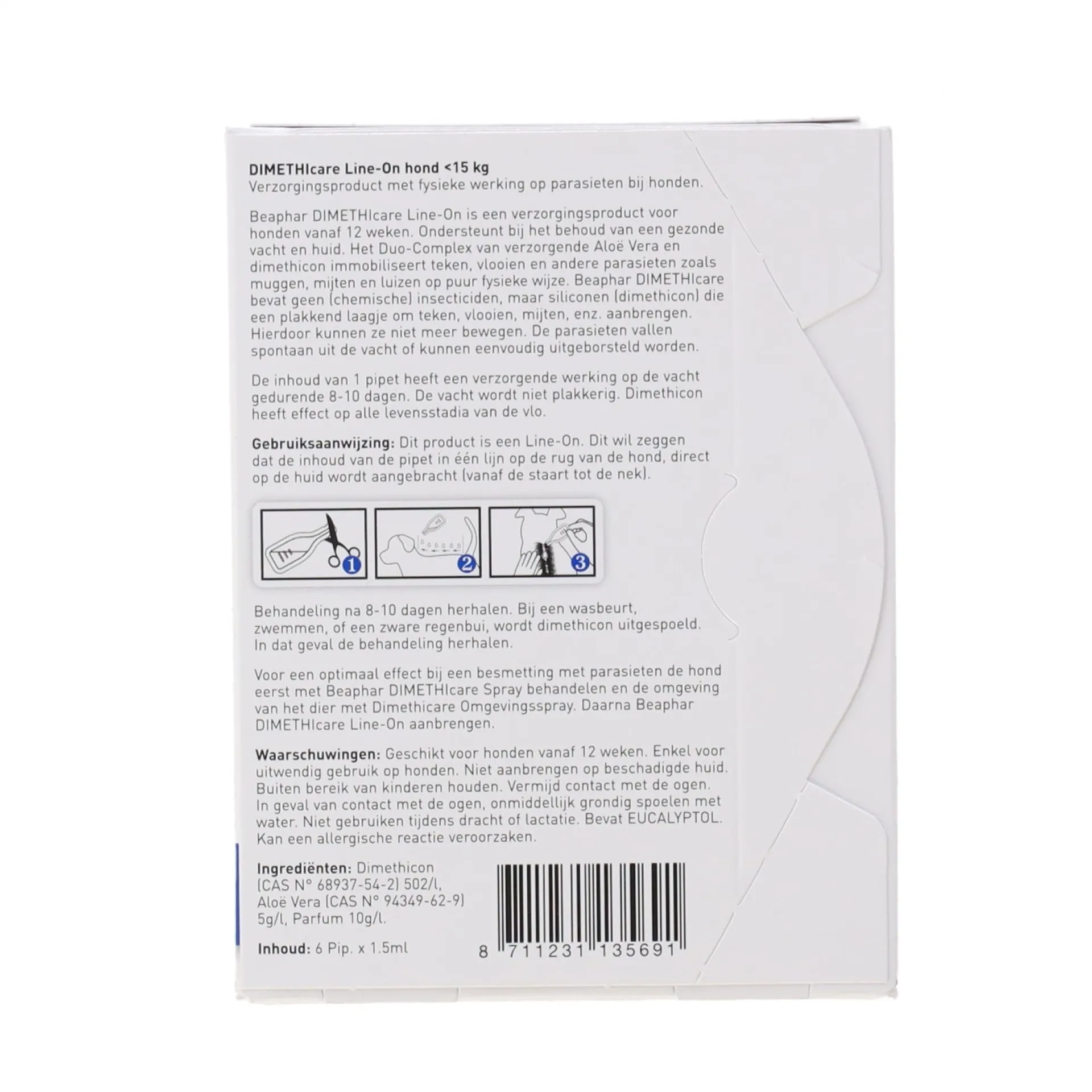 DIMETHIcare Line-On is een verzorgingsproduct voor honden vanaf 12 weken. Het Duo-Complex van verzorgende Aloë Vera en dimethicon immobiliseert teken, vlooien en andere parasieten zoals muggen, mijten en luizen op puur fysieke wijze.