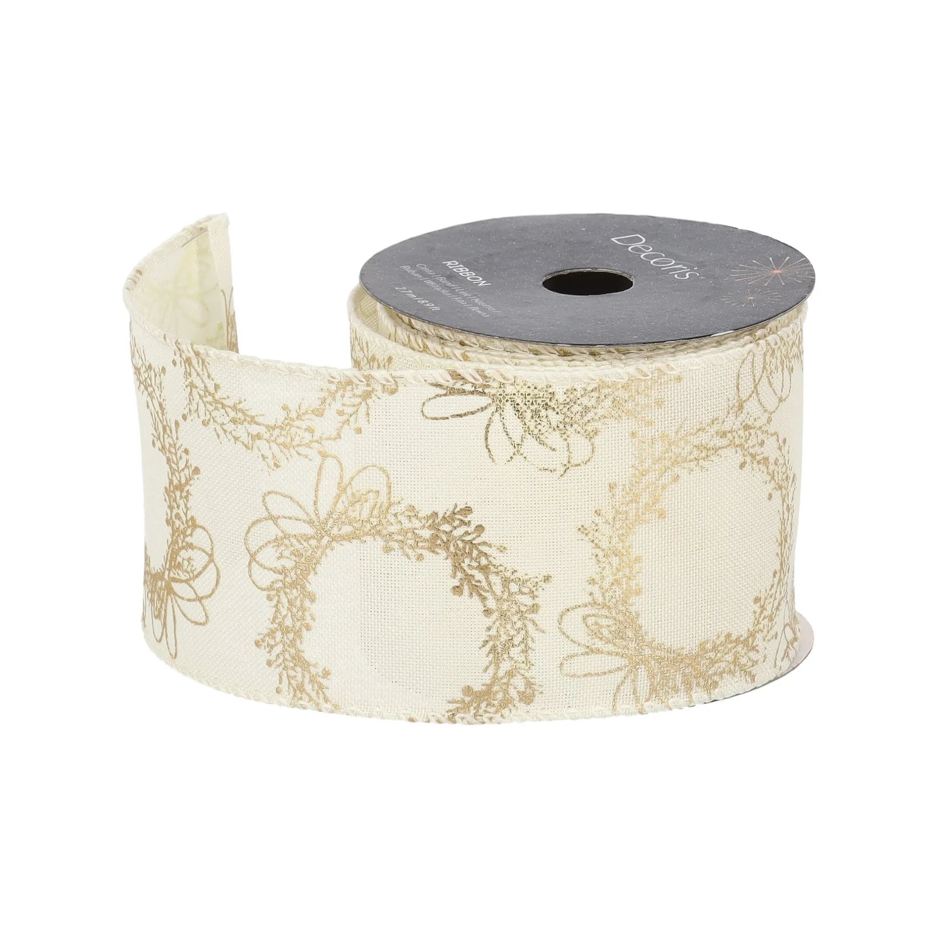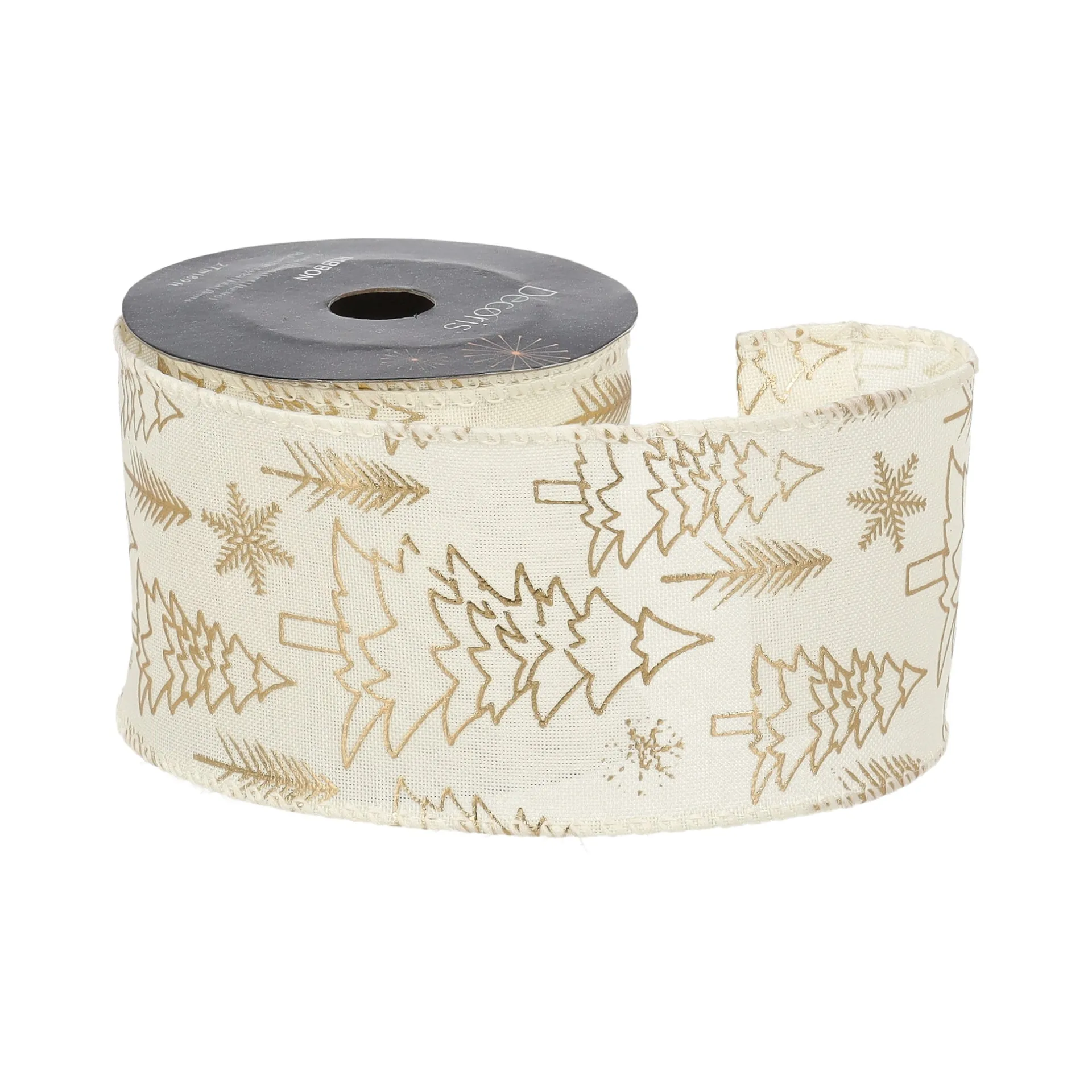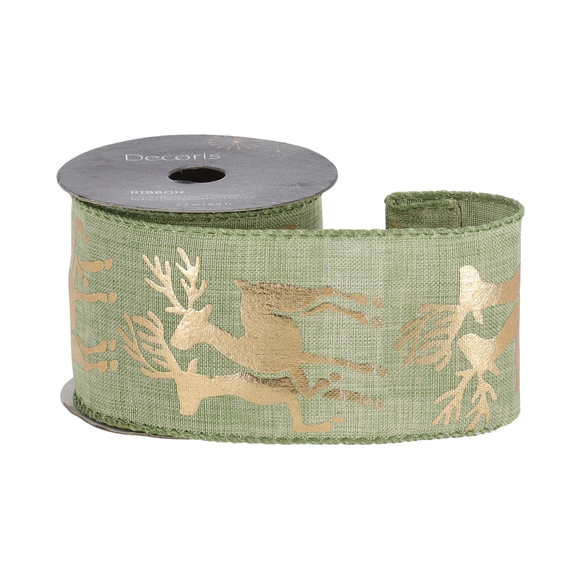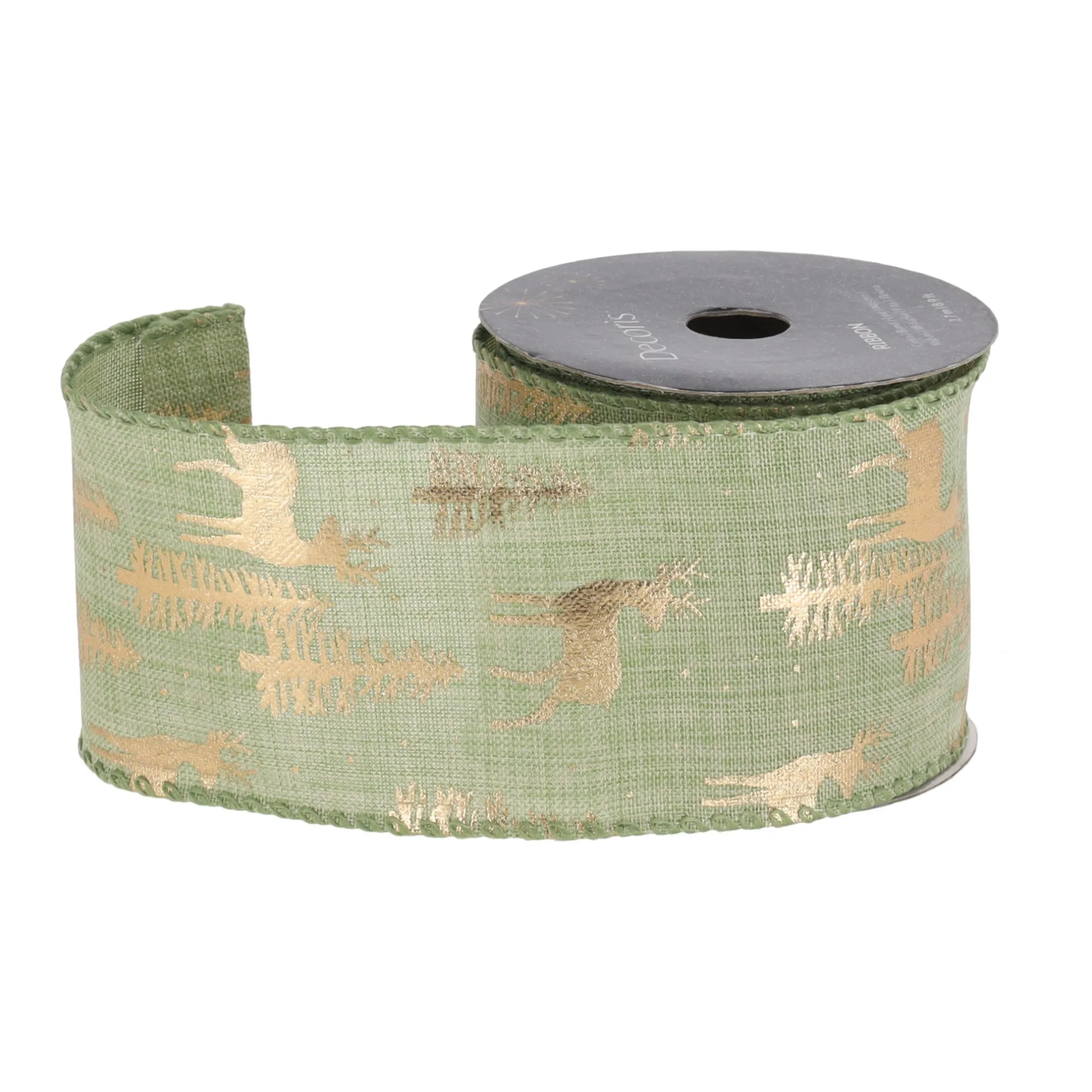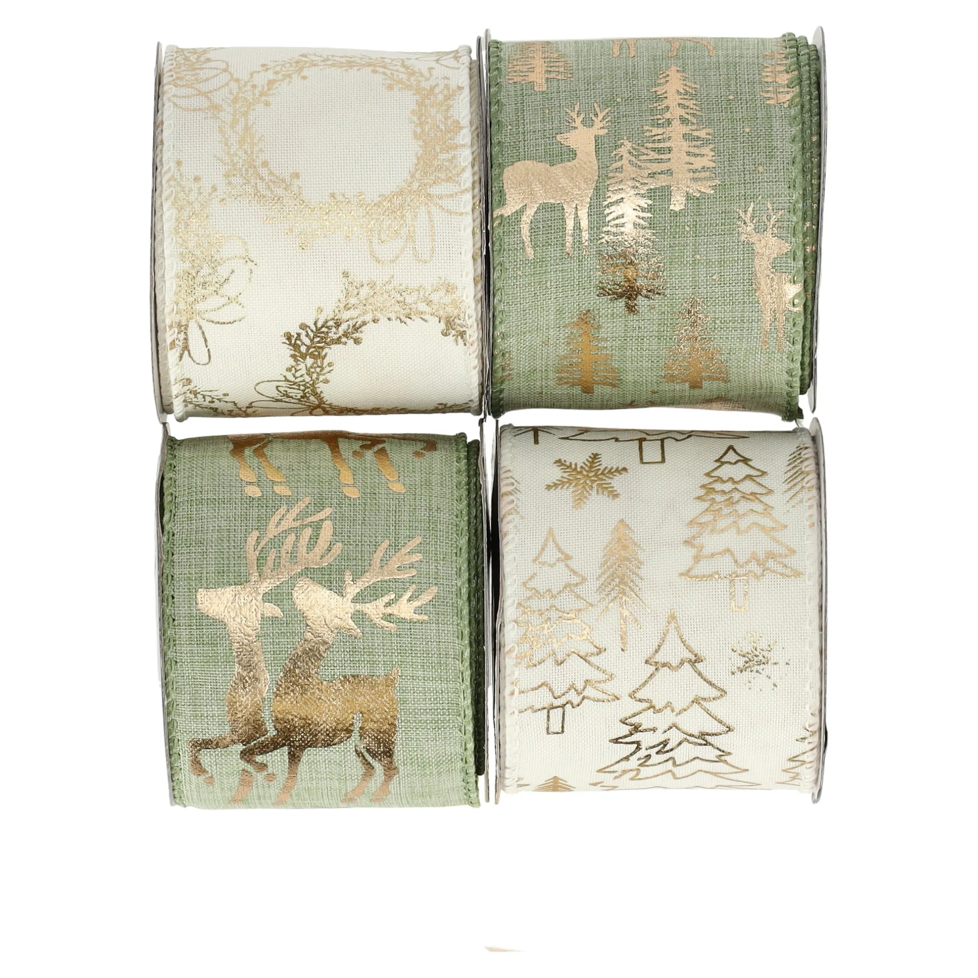 Cadeaulint in groen en wit met gouden kerstmotieven. Verkrijgbaar in vier varianten met rendieren, kerstbomen en kransen. Ideaal om cadeaus feestelijk in te pakken of te gebruiken bij kerstdecoratie.
